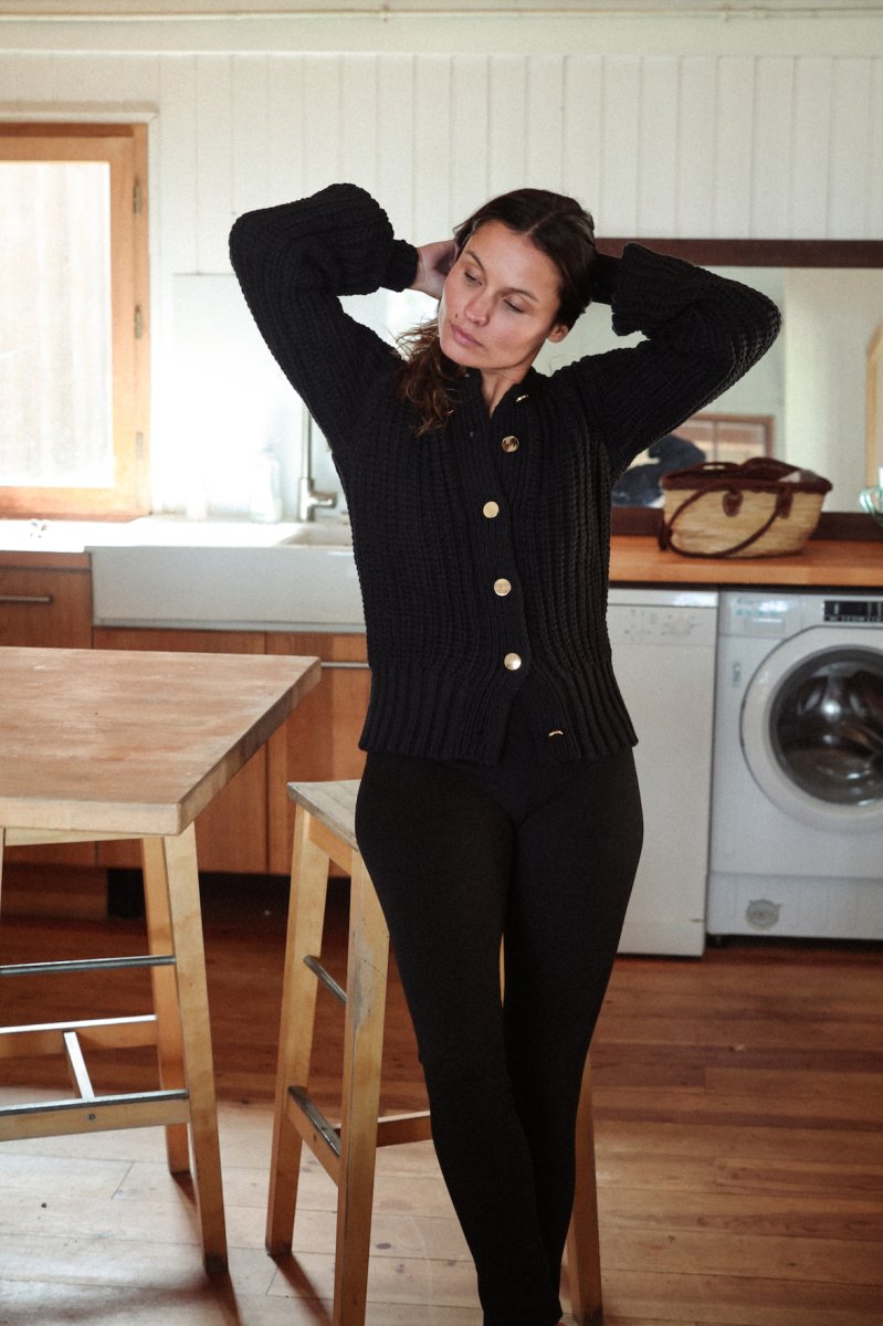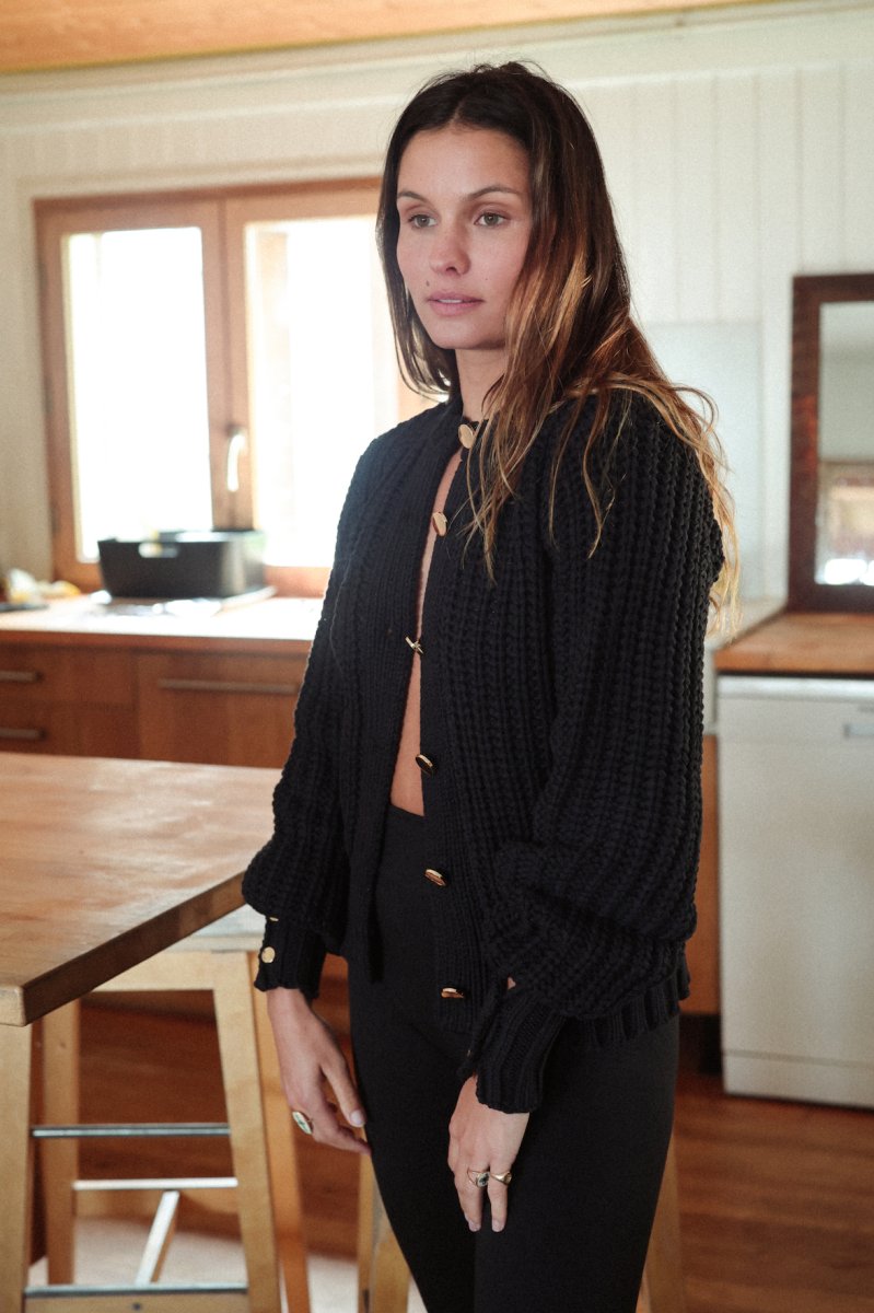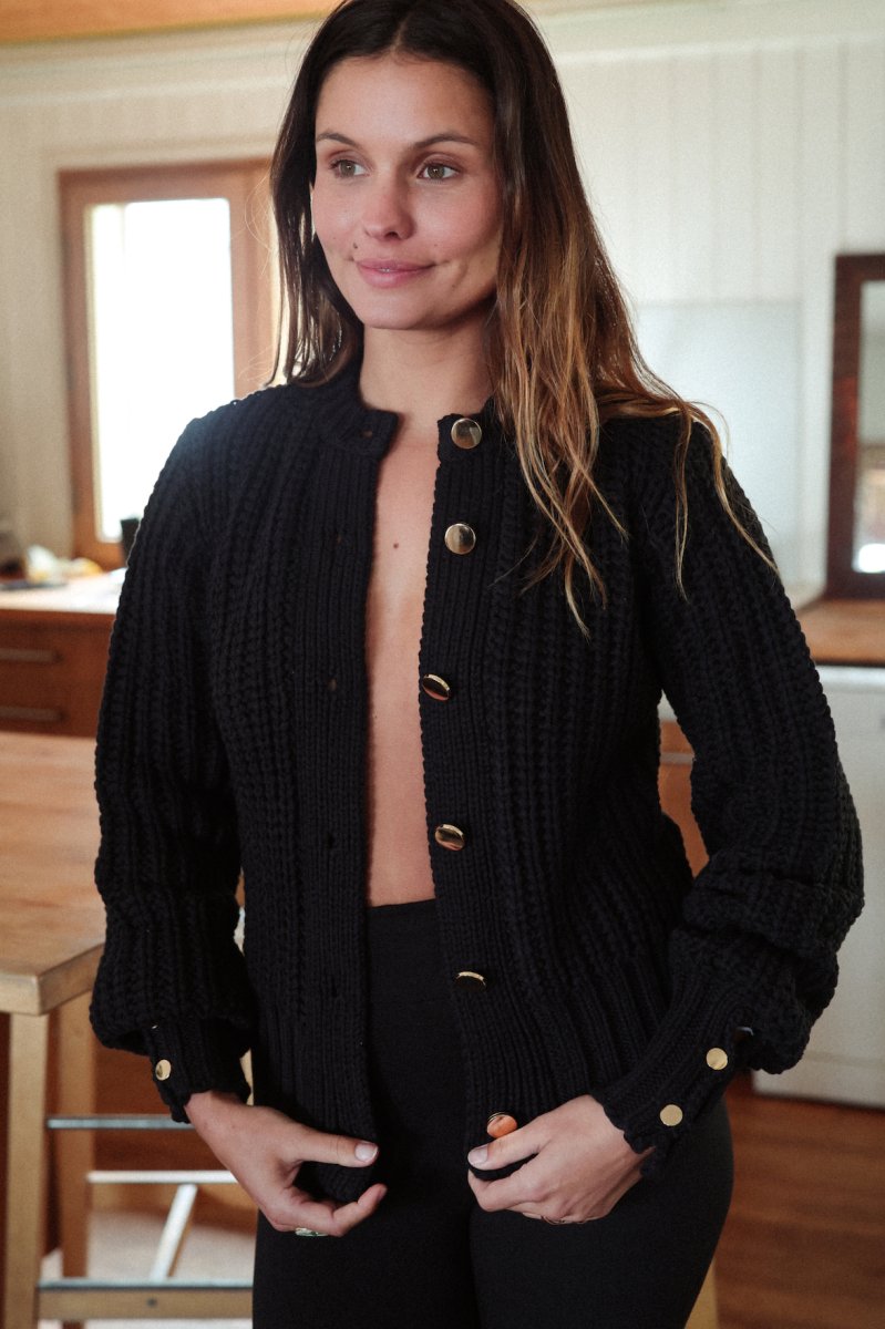 CARDIGAN MAILLE EN CROCHET Col rond montant Ouverture devant avec boutons dorés Manches longues bouffantes avec 2 petits boutons aux poignets Tricotage en tresses Doux, chaud et en fibre naturelle