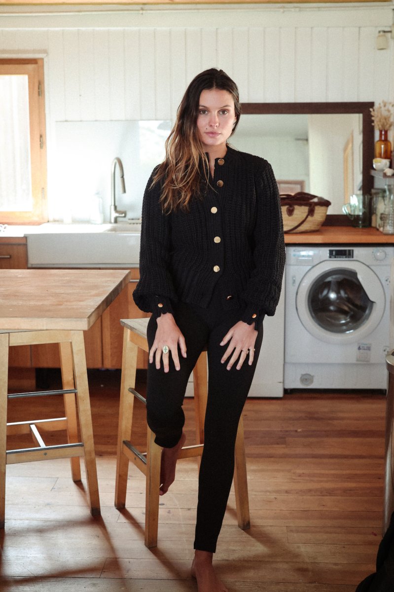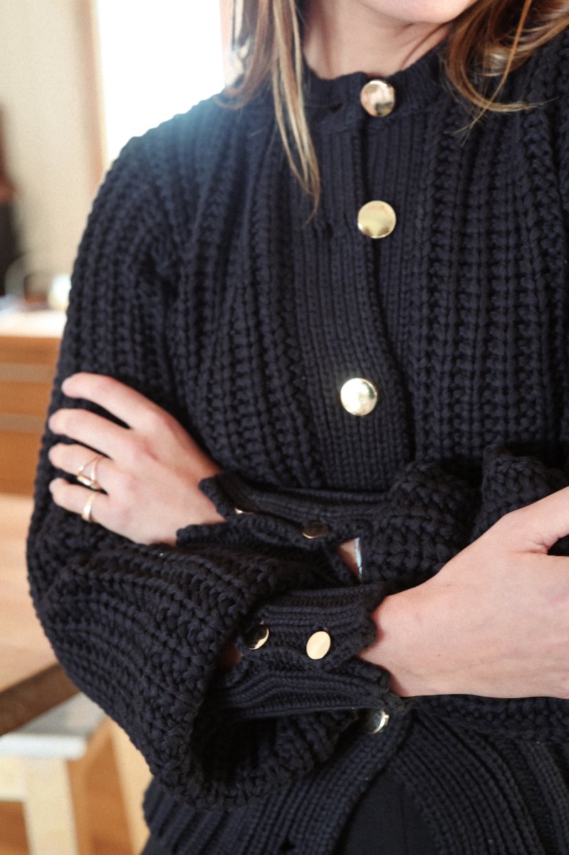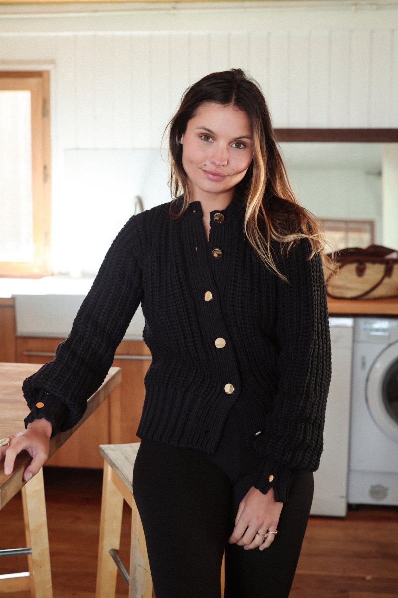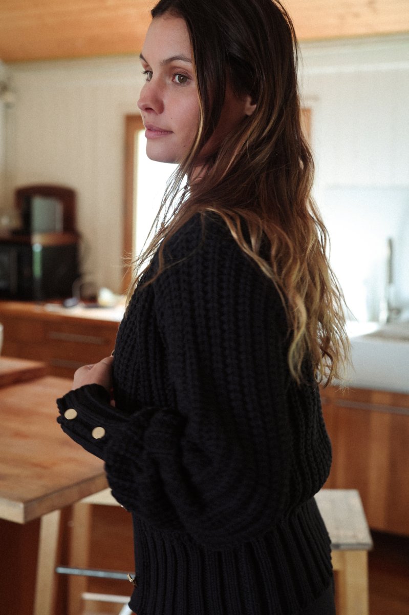 CARDIGAN MAILLE EN CROCHET Col rond montant Ouverture devant avec boutons dorés Manches longues bouffantes avec 2 petits boutons aux poignets Tricotage en tresses Doux, chaud et en fibre naturelle