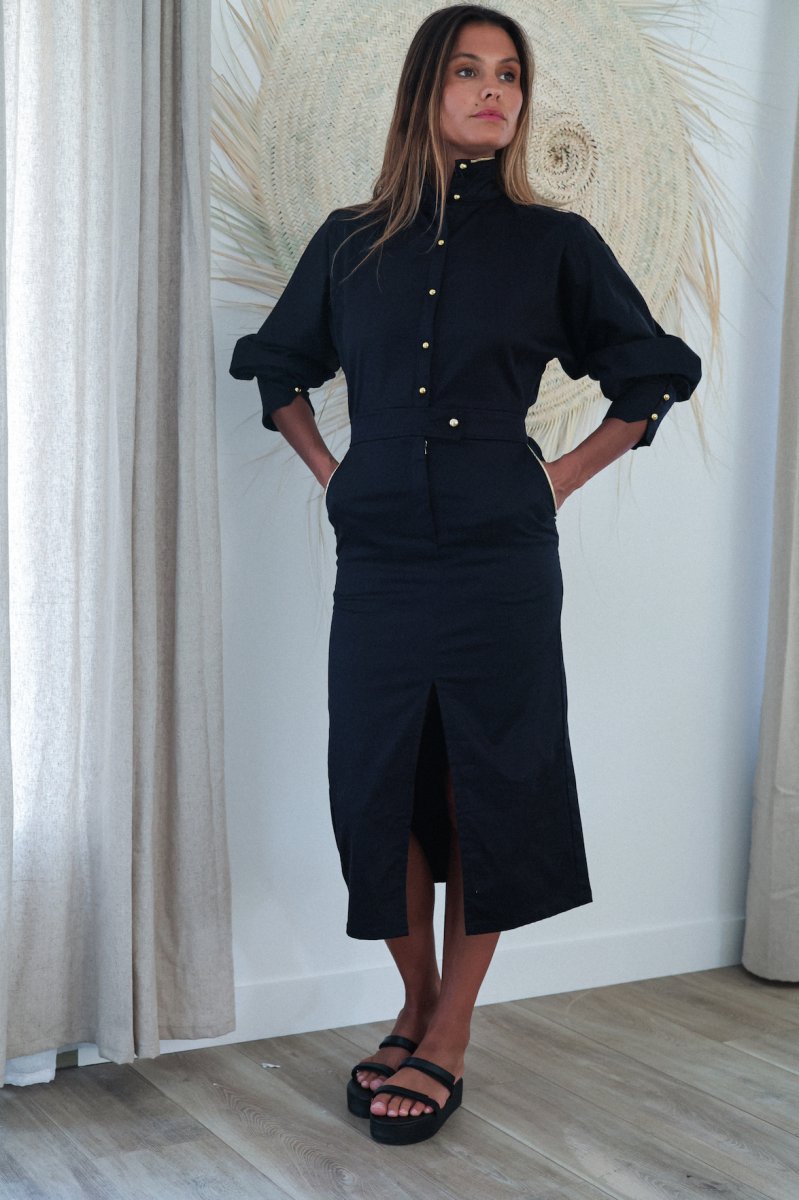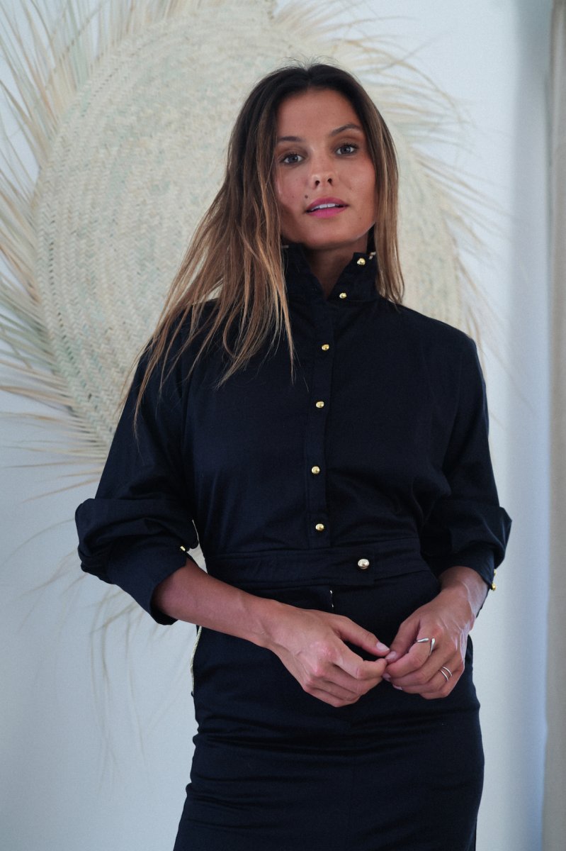 Combinaison ROBE Coupe chemise large, épaules tombantes Col haut avec liserés dorés Manches bouffantes longues avec 2 boutons au poignets Élastique à la taille avec zip de fermeture Sur la jupe 2 poches à l’italienne avec liserés dorés devant Petite fente devant