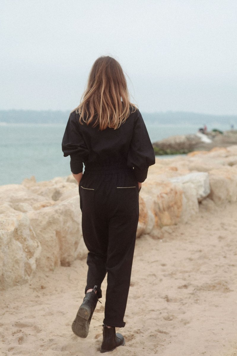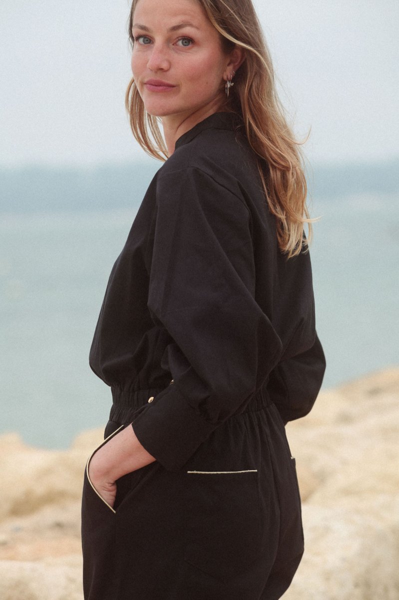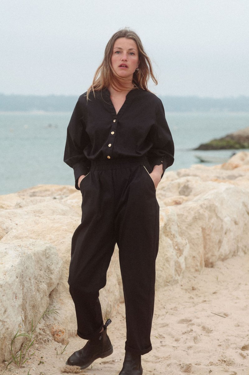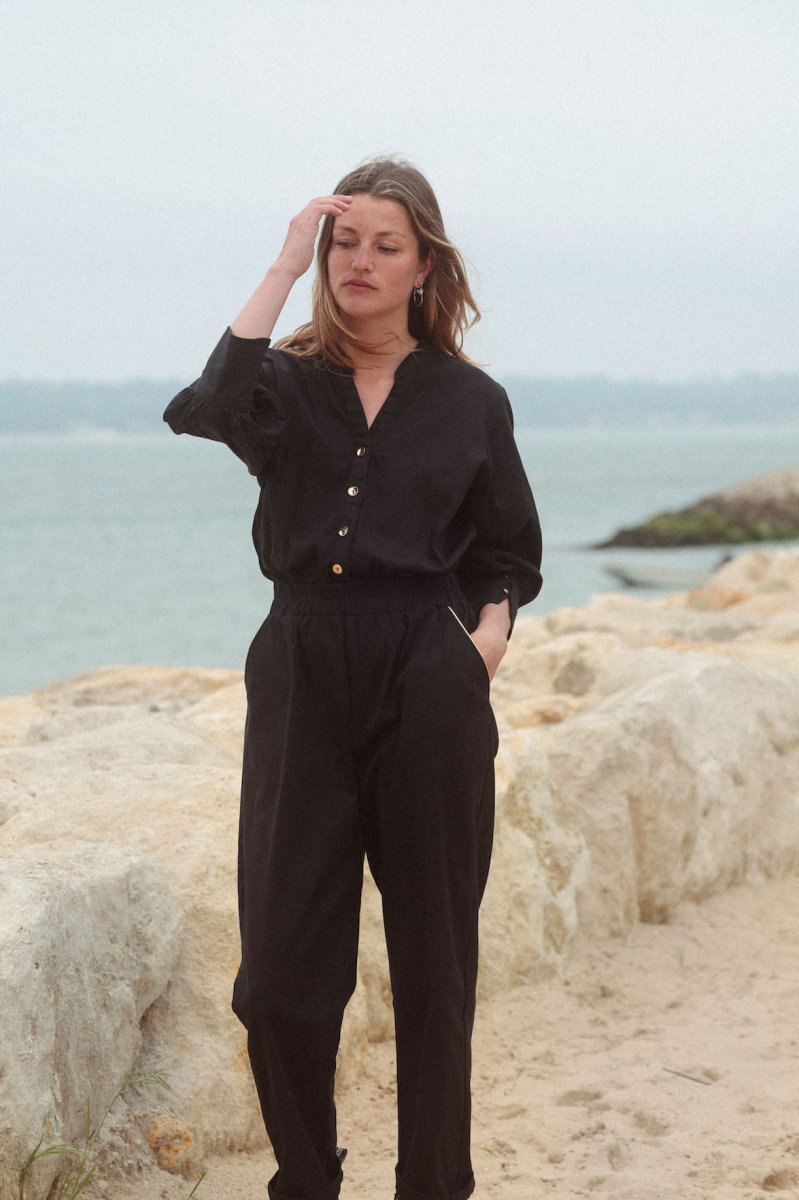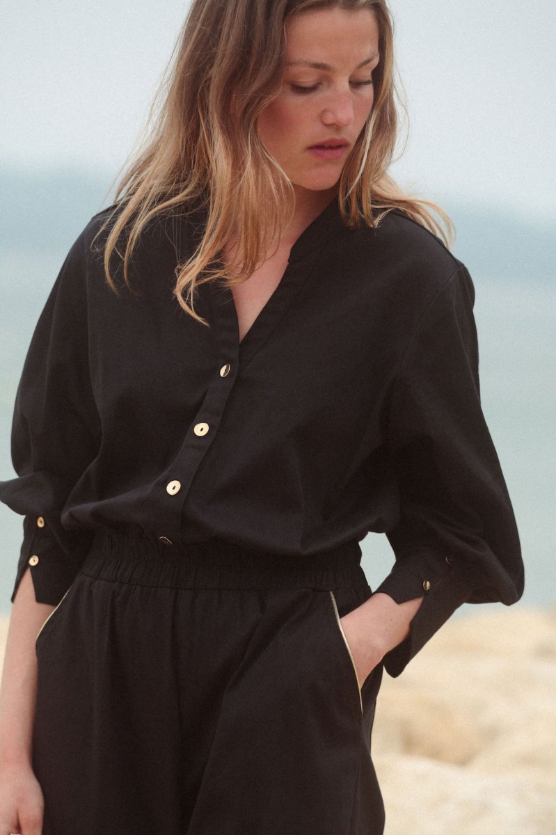 Combi pantalon Twill Col V tunisien Manches bouffantes longues avec 2 boutons au poignets Élastique à la taille Sur le pantalon 2 poches à l’italienne avec liserés dorés devant Et 2 petites poches au dos