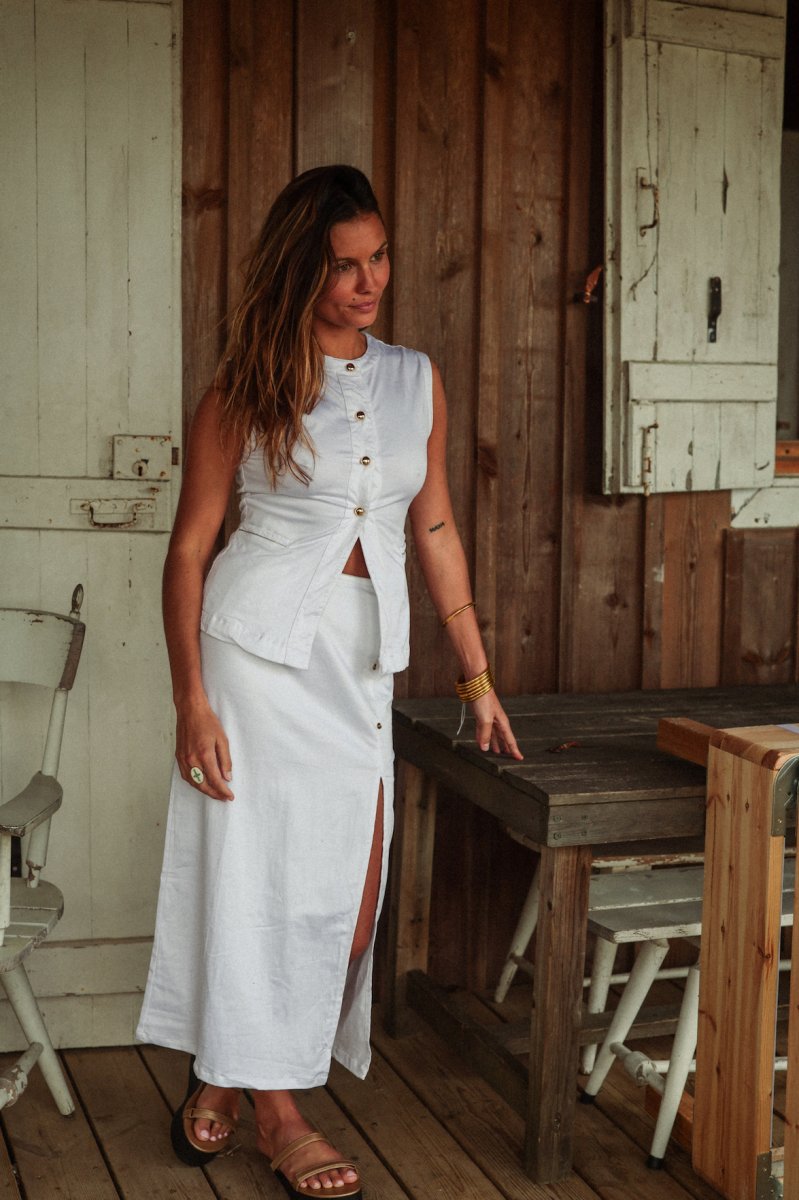 Jupe longue, douce et fluide Coupe droite taille haute, avec liseré doré à la taille 3 petits boutons au dessus d’une jolie fente Se ferme avec zip sur le côté