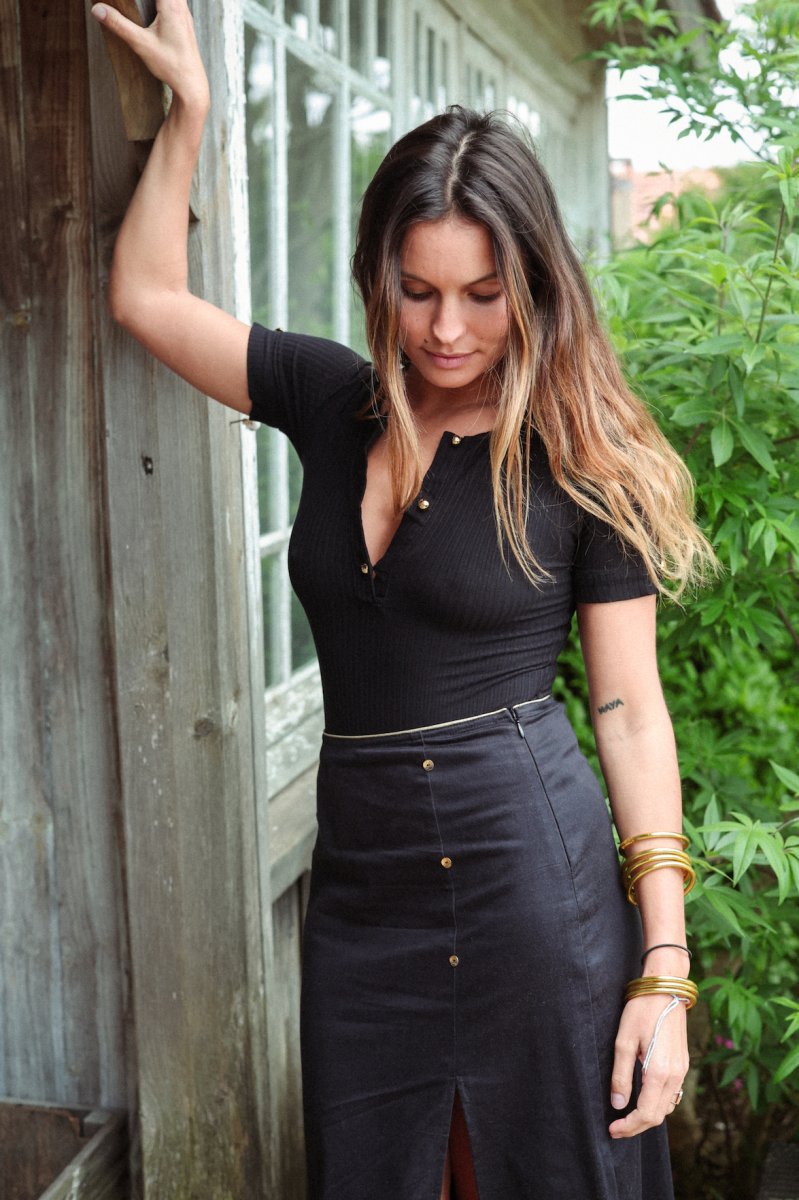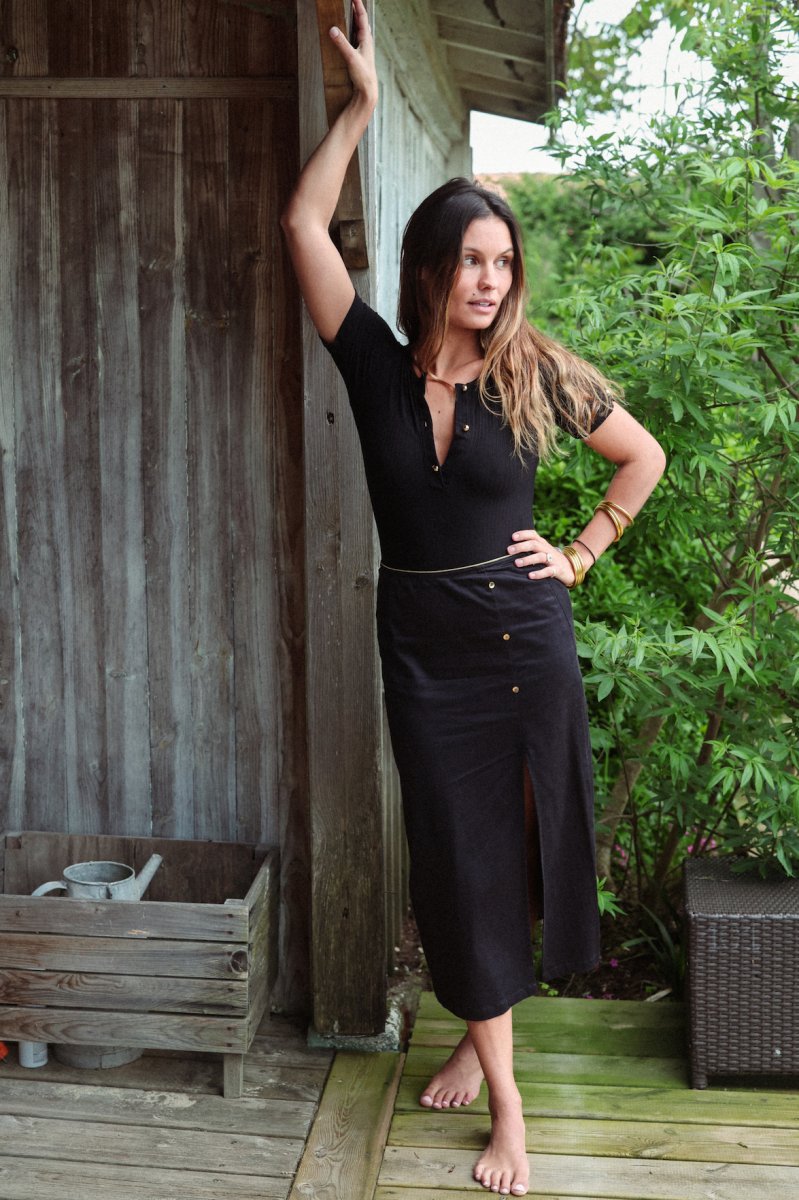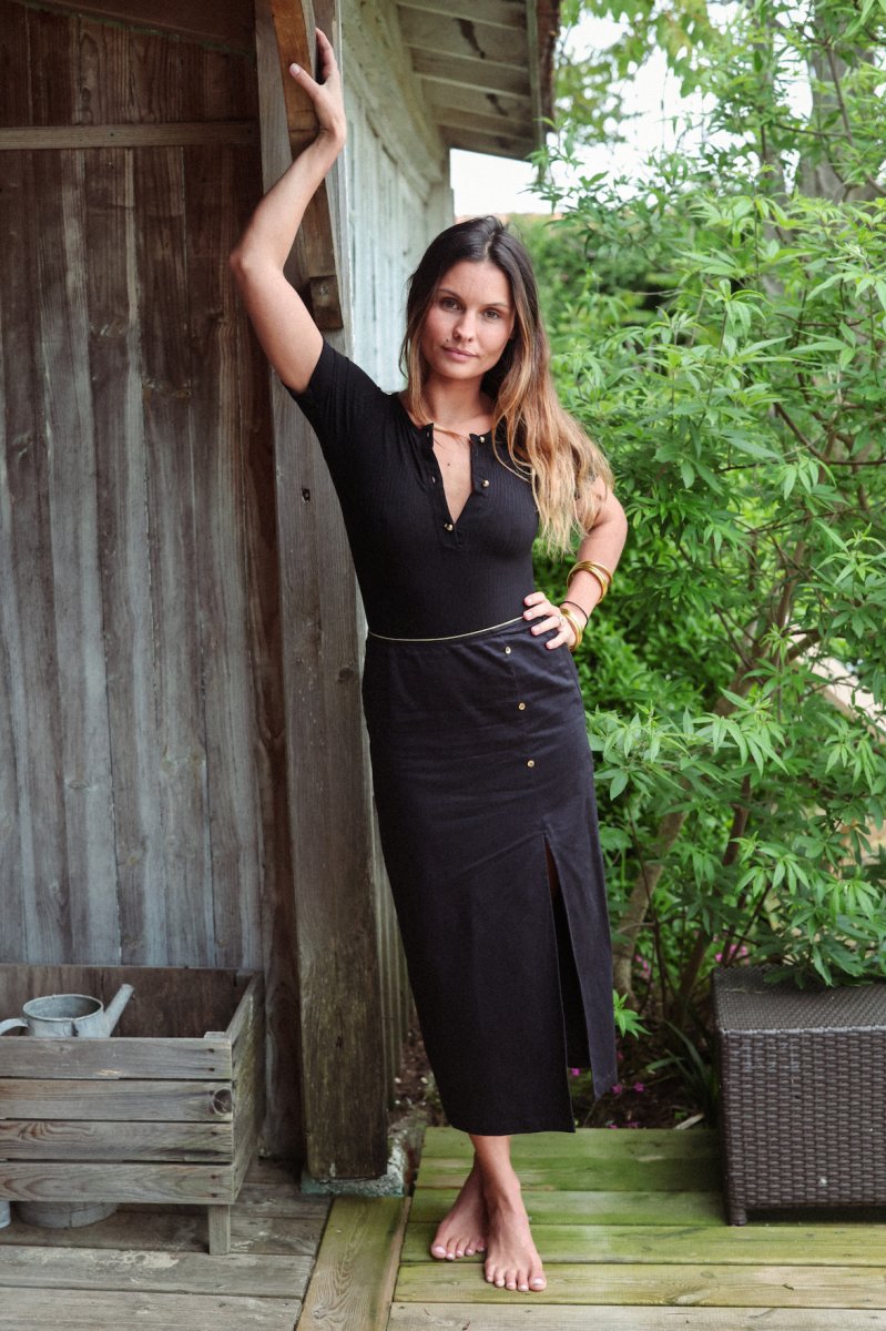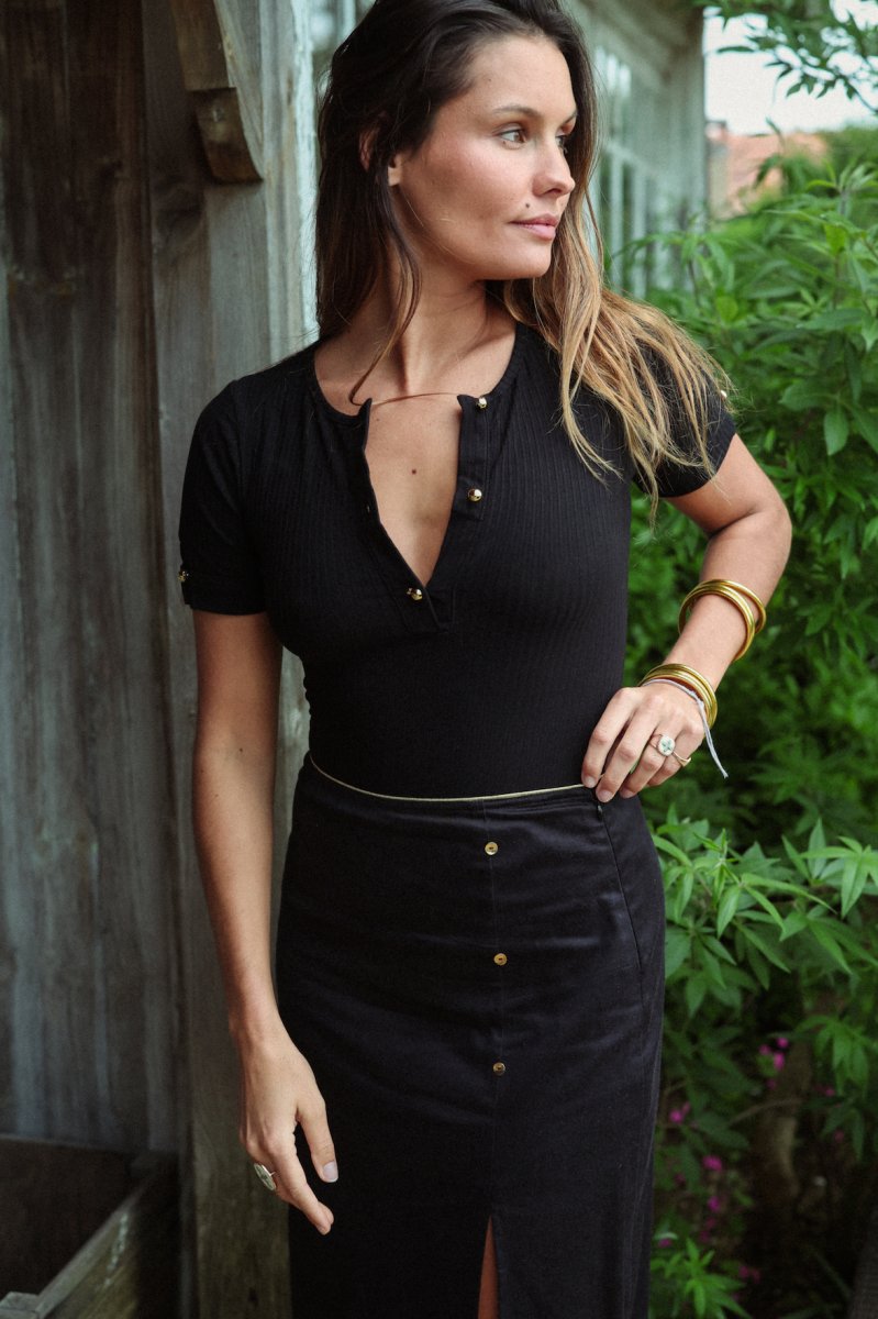 ENSEMBLE AVEC TOP VESTE Jupe longue, douce et souple Coupe droite taille haute, avec liseré doré à la taille 3 petits boutons au dessus d’une jolie fente Se ferme avec zip sur le côté