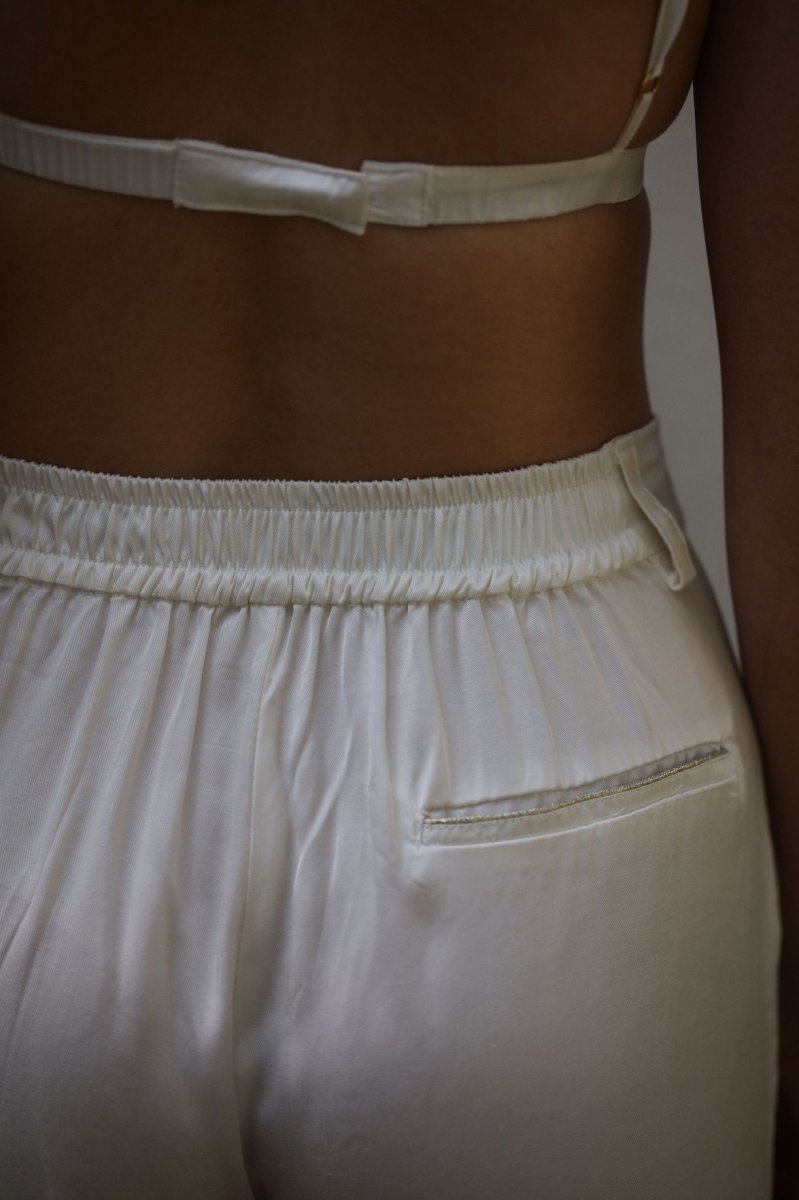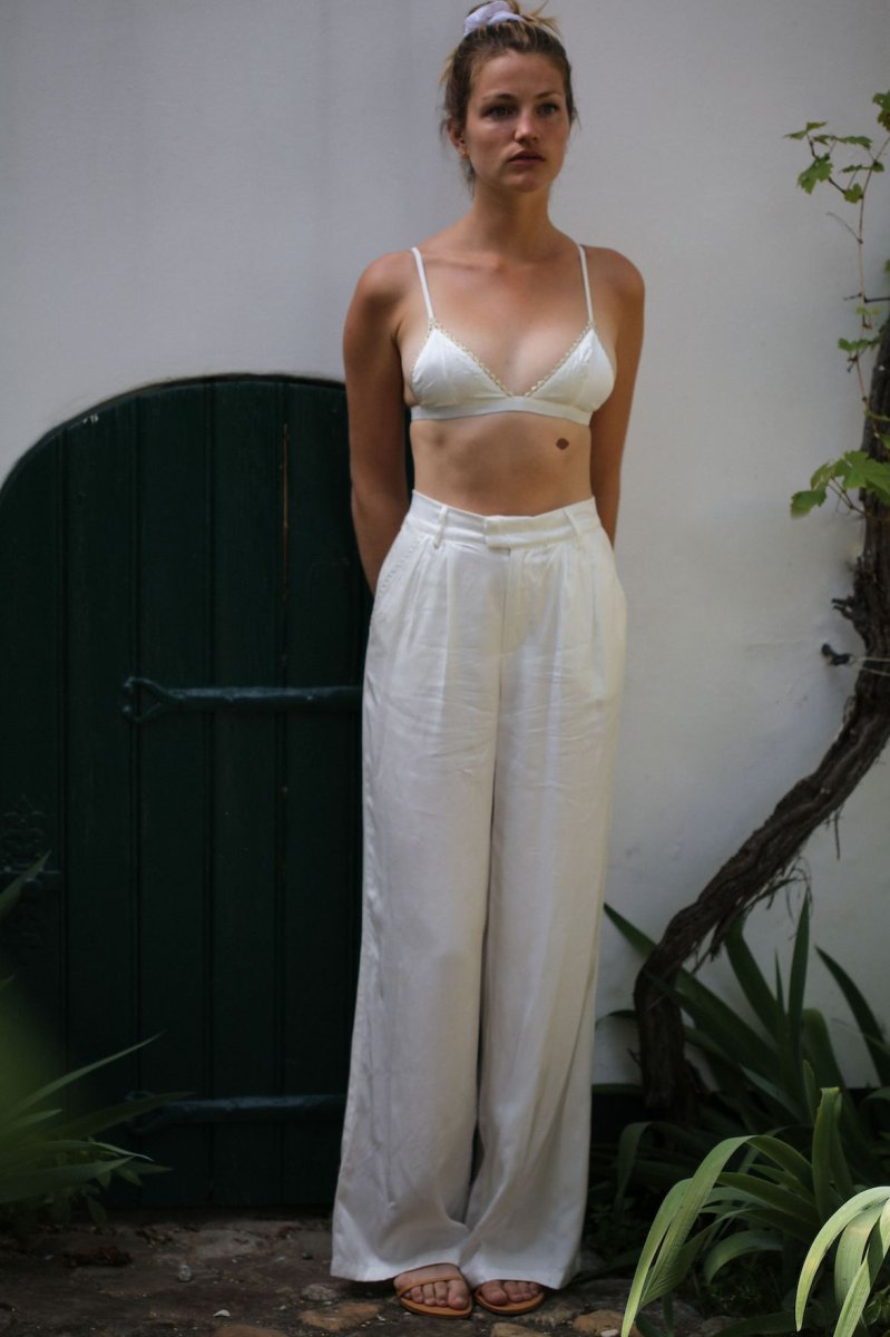 Pantalon costume, douce et fluide Coupe large taille haute, avec deux pinces à l’avant Deux poches à l’italienne devant avec liserés dorés et une poche simple à l’arrière Se ferme avec zip intérieur