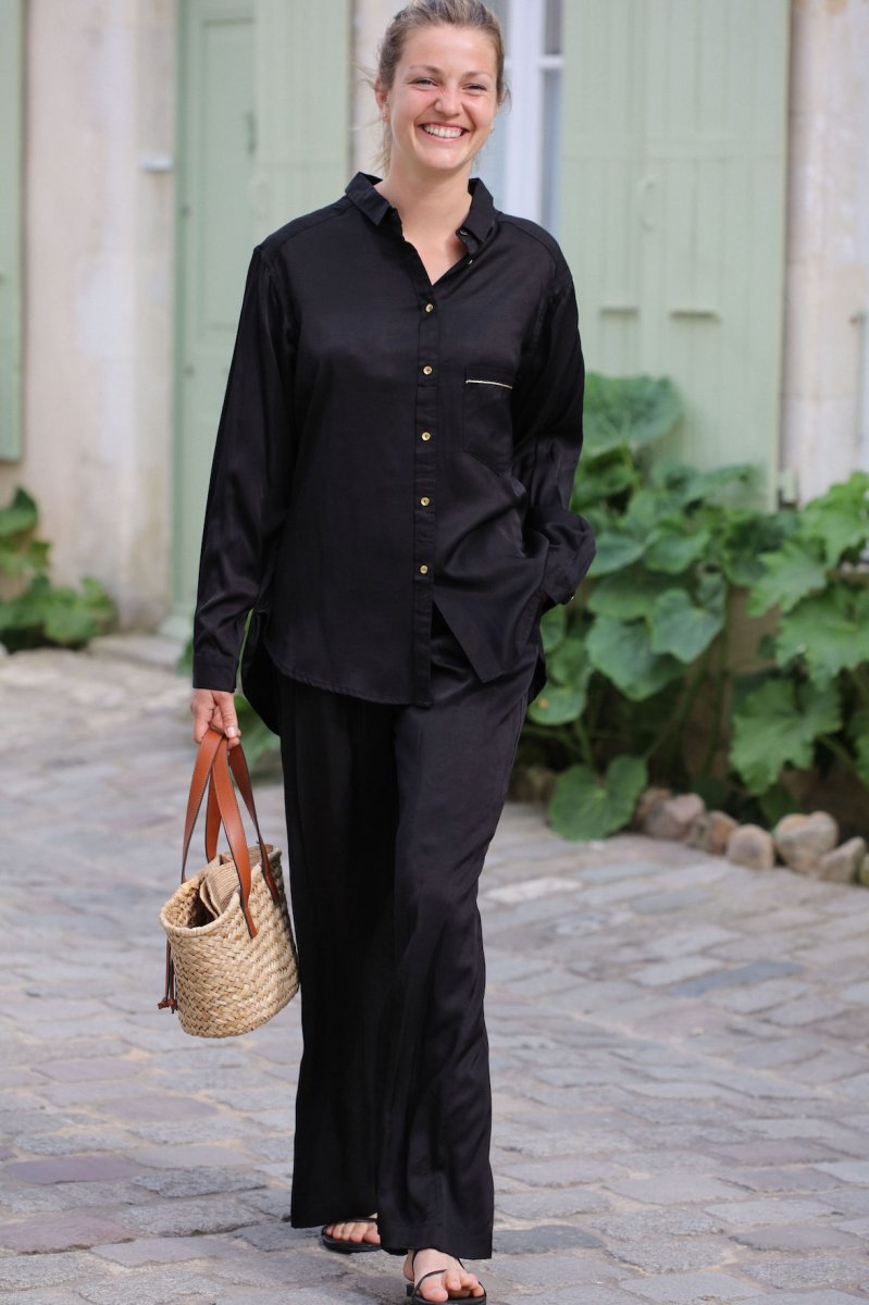 Pantalon costume, douce et fluide Coupe large taille haute, avec deux pinces à l’avant Deux poches à l’italienne devant avec liserés dorés et une poche simple à l’arrière Se ferme avec zip intérieur