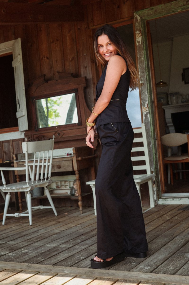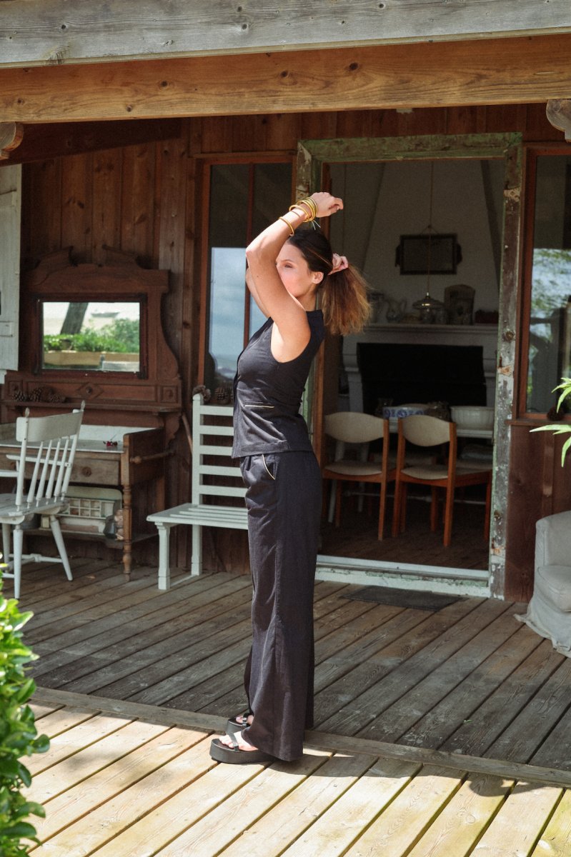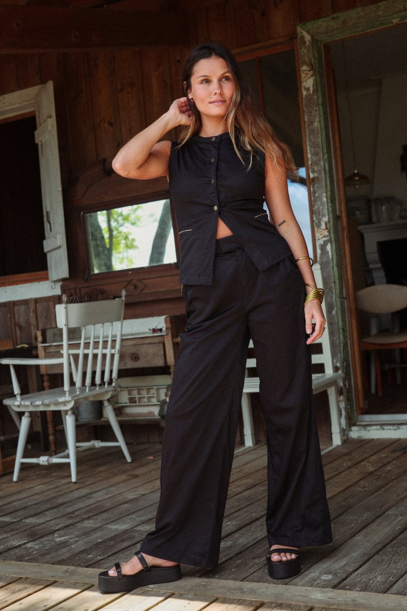 ENSEMBLE AVEC TOP VESTE Pantalon palazzo en Rayon spandex Coupe large souple, taille haute, avec deux pinces à l’avant Deux poches à l’italienne devant avec liserés dorés et une poche simple à l’arrière Se ferme avec zip intérieur