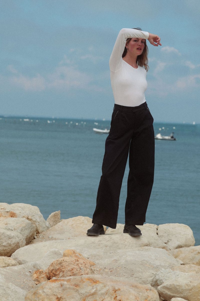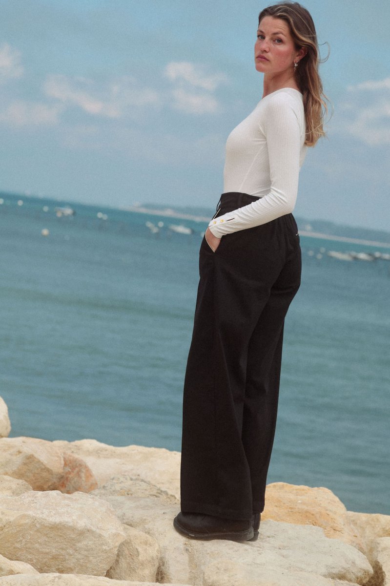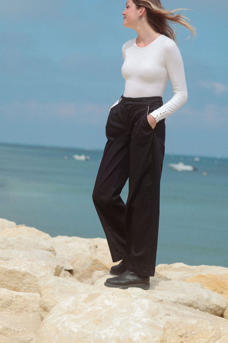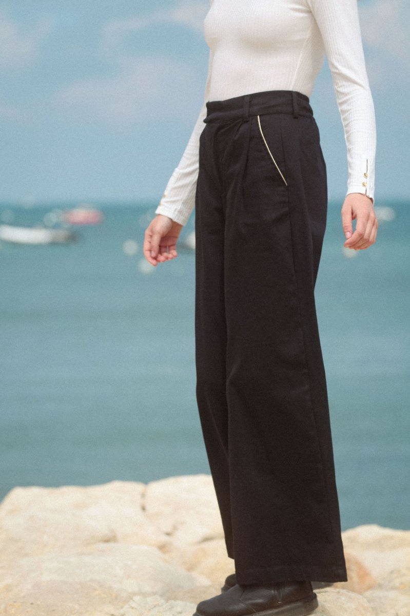 Pantalon costume en Twill Coupe large taille haute, avec deux pinces à l’avant Deux poches à l’italienne devant avec liserés dorés et une poche simple à l’arrière Se ferme avec zip intérieur