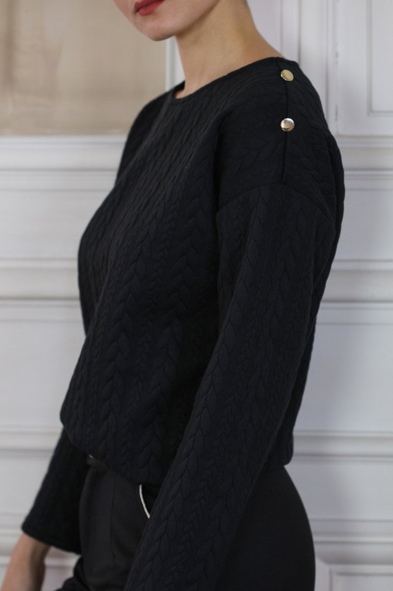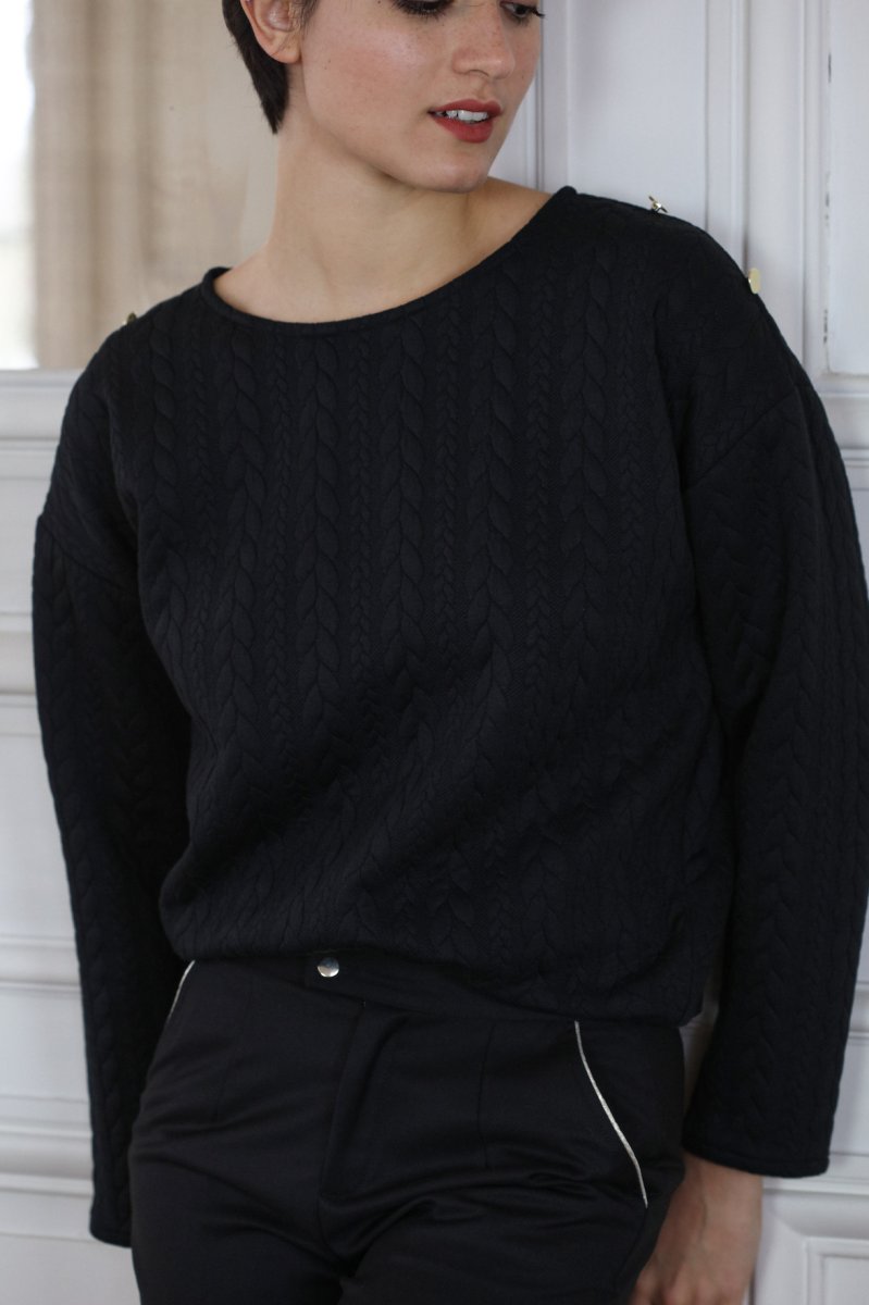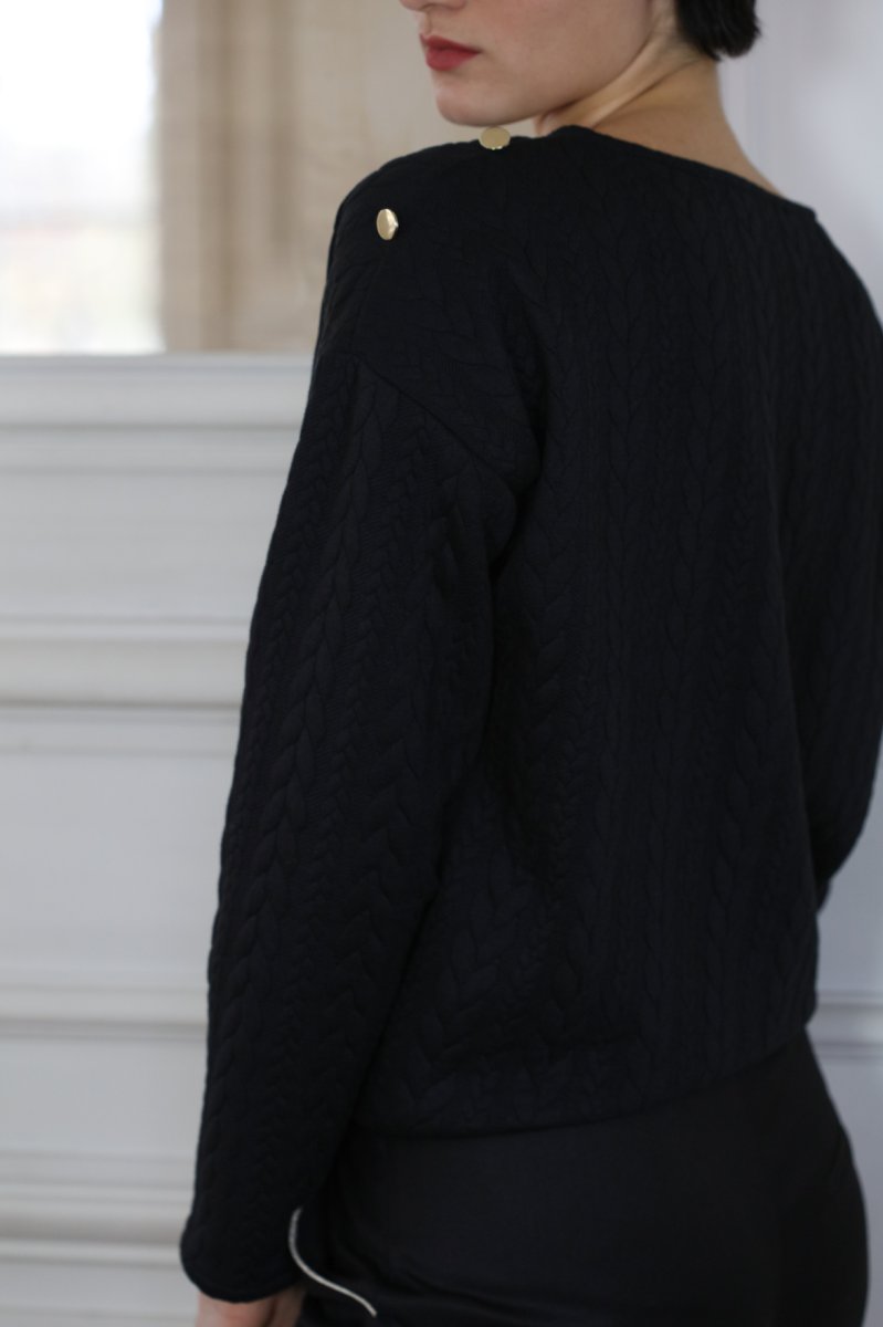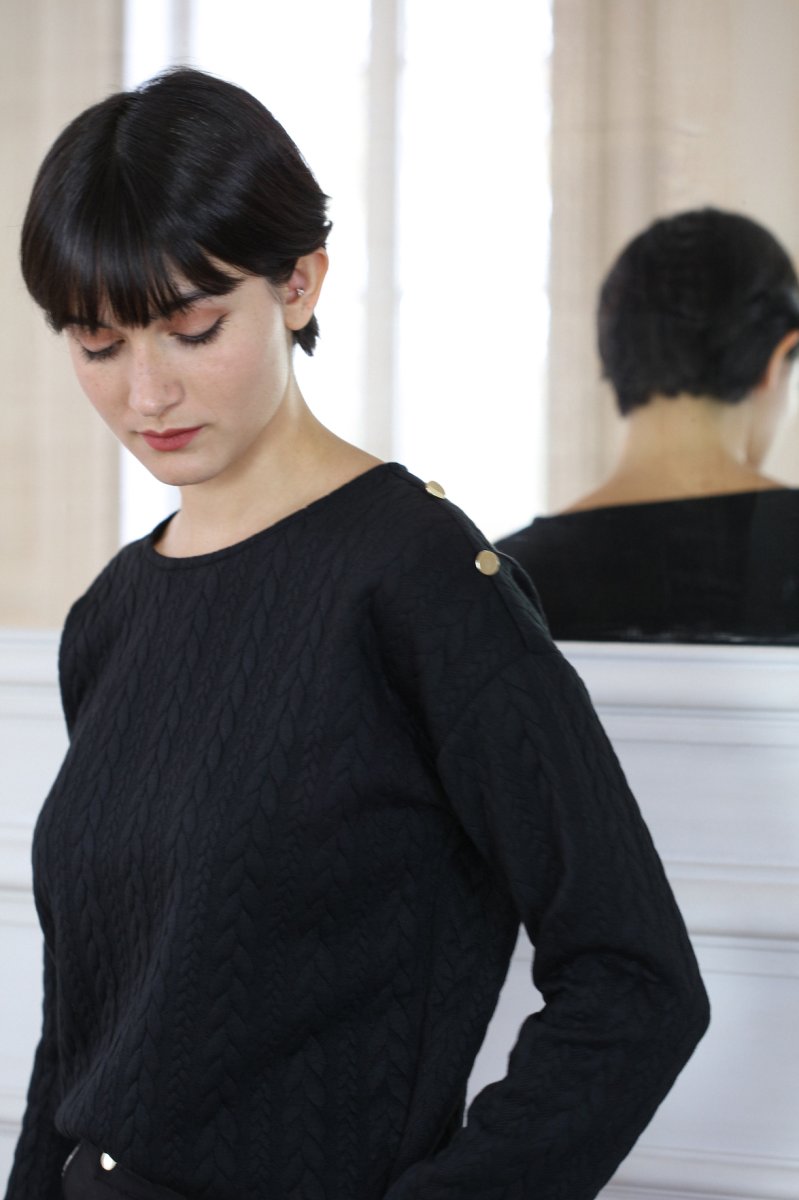 Le pull style vintage qu’on aime, pour un look simple et élégant on opte pour LANA C’est LE pull à adopter pour la saison. • Pull noir, forme ample resserré à la taille • Manches longues • Matière en jersey torsadé • 2 Boutons sur les épaules Ce produit à été fabriqué avec amour dans mon atelier Bordelais Envoi sous 5 à 10 jours ouvrés