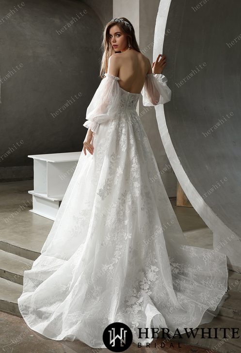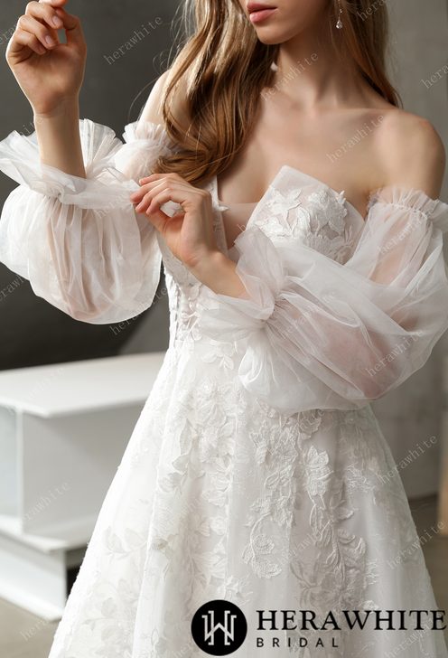 - Avantage : Robe De Mariée A Fleurs traîne, manches longues amovibles, sequins, dentelle florale