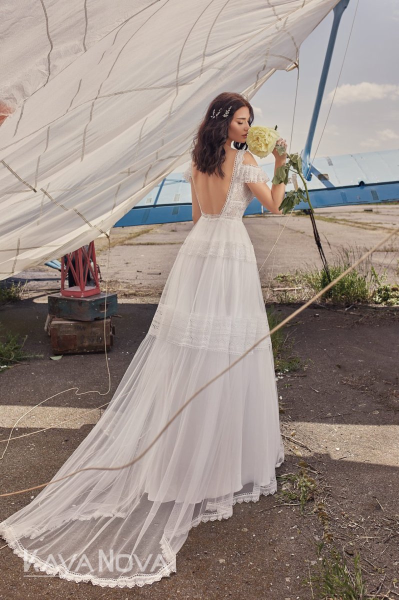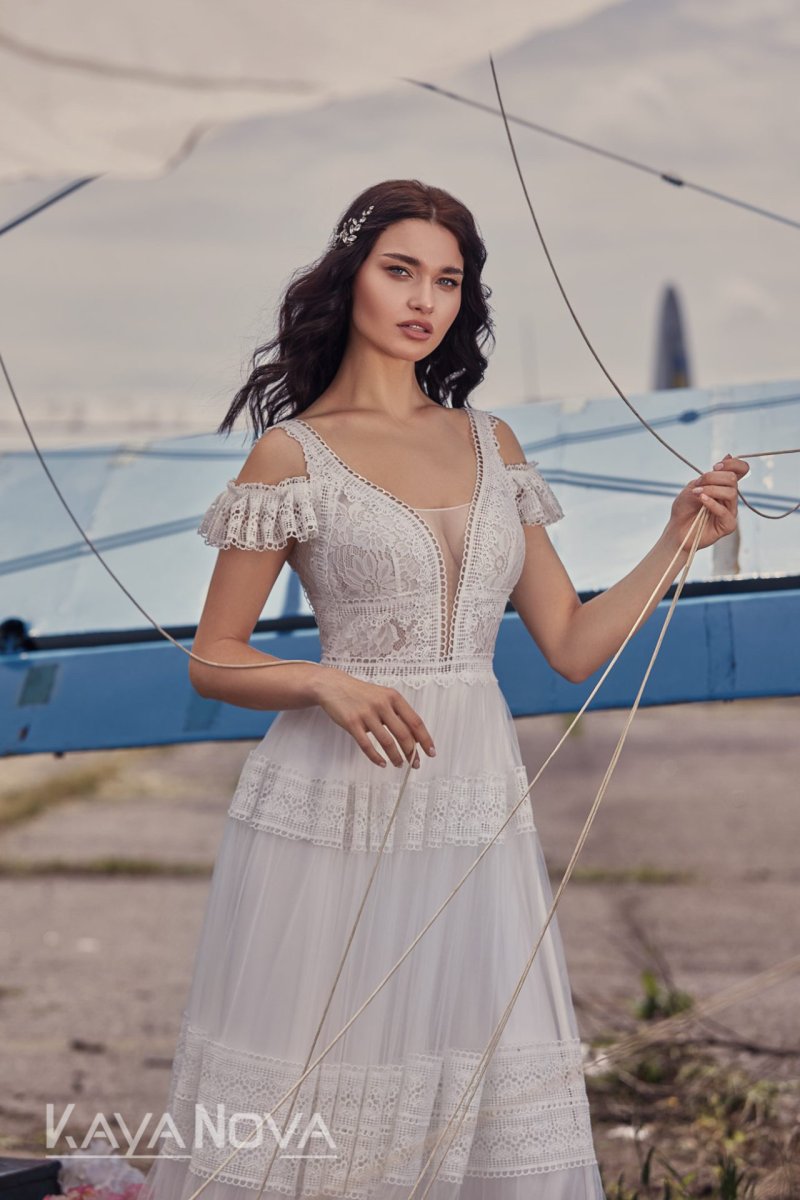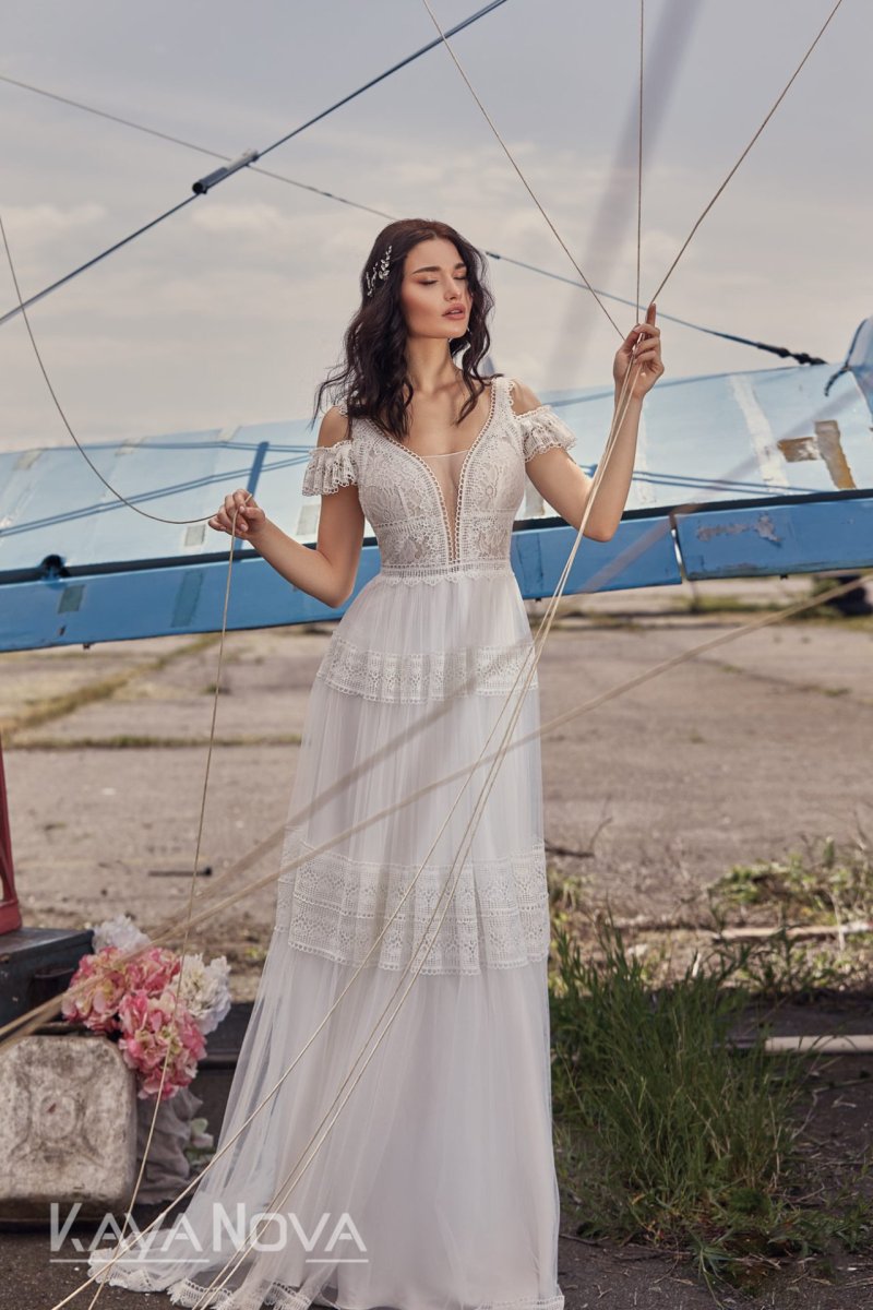 La dentelle blanche est synonyme de romantisme et d’élégance. Réputée pour sa finesse et la précision de ses motifs, elle ajoute une touche de raffinement incomparable à toute robe de mariée . Sur notre modèle, la dentelle blanche orne délicatement le haut de la robe, créant un contraste magnifique avec le tulle du jupon.