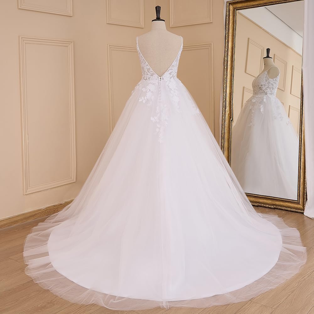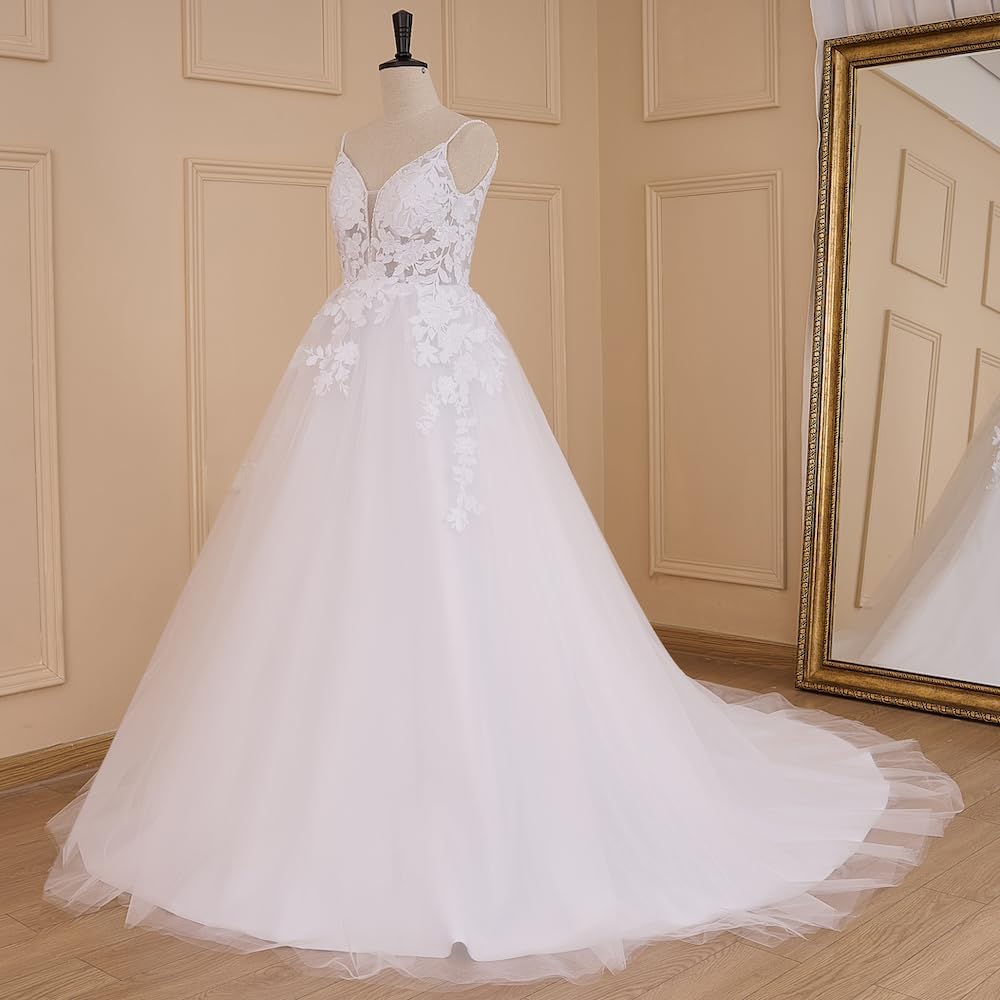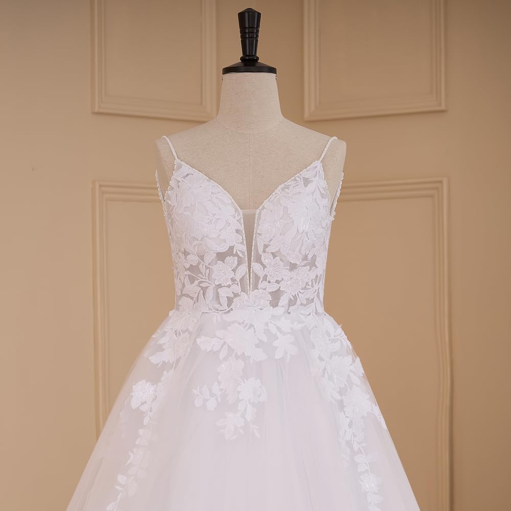 La robe de mariée blanche dentelée est faite de matière de haute qualité. Elle est confectionnée de tulle blanc, ce qui en fait une robe de mariée élégante et soignée. La robe a des bretelles ajustables pour un ajustement parfait.