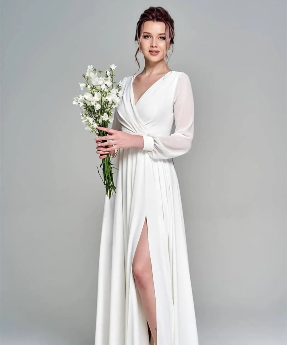 - Avantage : Robe De Mariée Empire manches longues, ceinture tissu, col V, fente