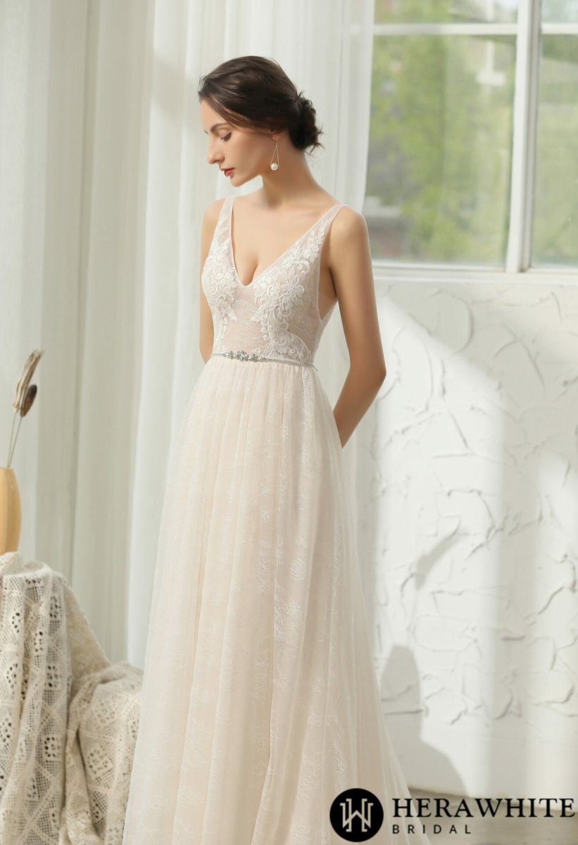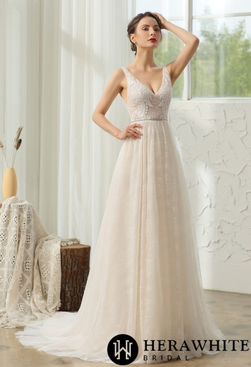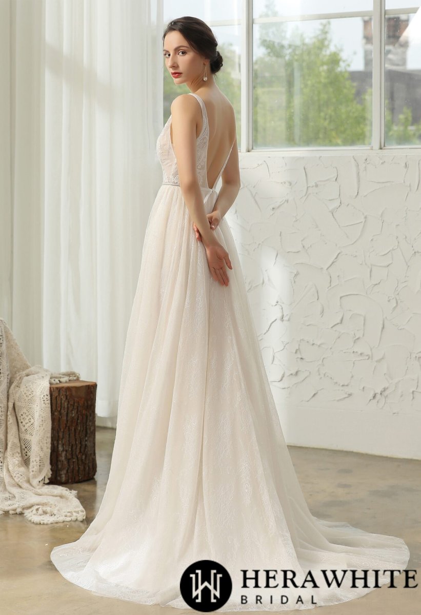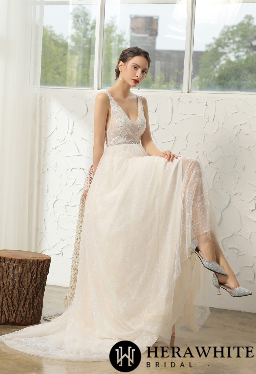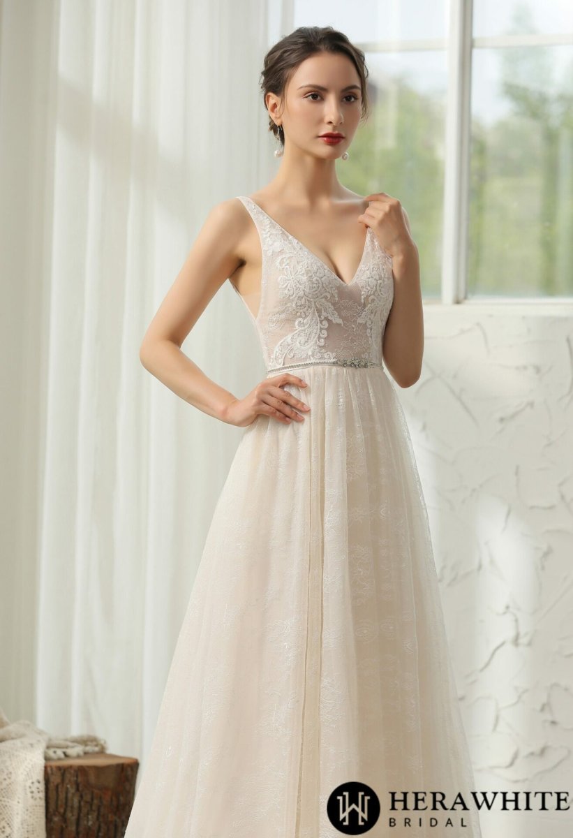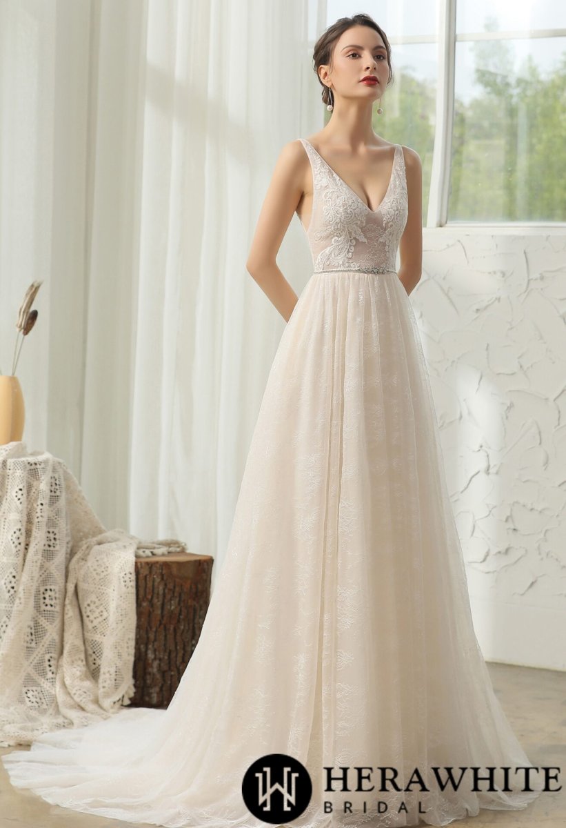 La Robe de mariée en dentelle avec ceinture en perles est sublimée par un décolleté en V et des appliques de dentelle qui ornent le corsage. Un dos en V ajoute une touche de séduction parfaite pour achever le look bohème de cette tenue de cérémonie à la silhouette A.