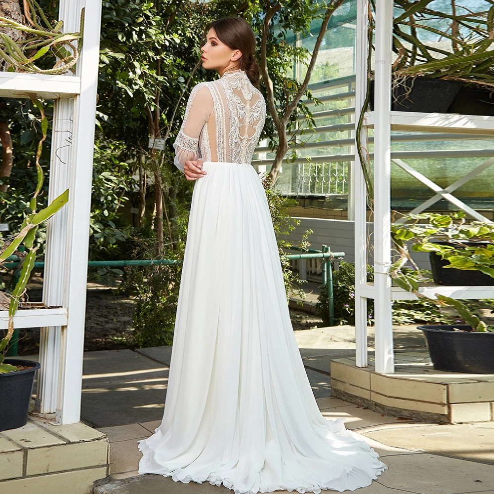 - Avantage : Robe De Mariée Fendue A Col Montant Dentellé manches longues, dentelle florale, traîne, fente