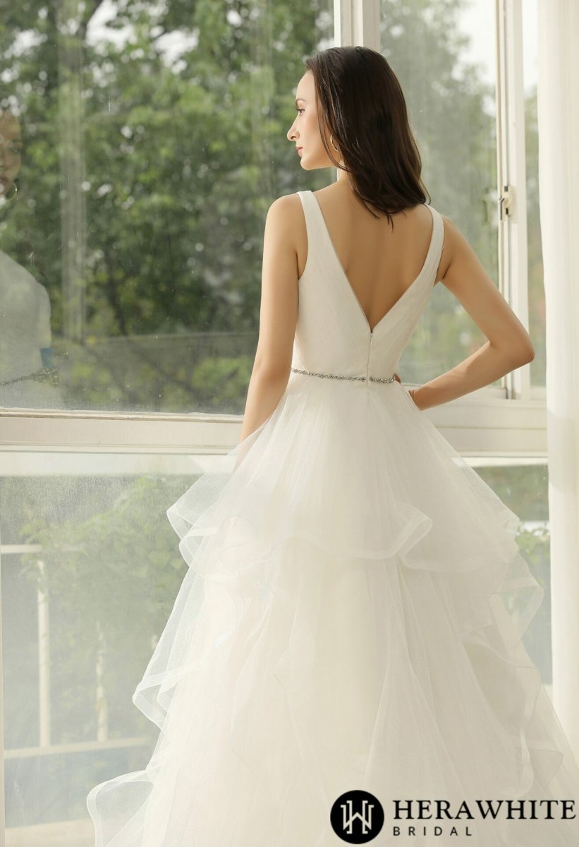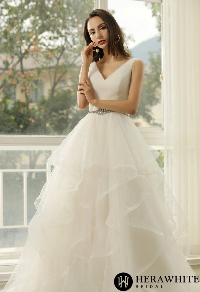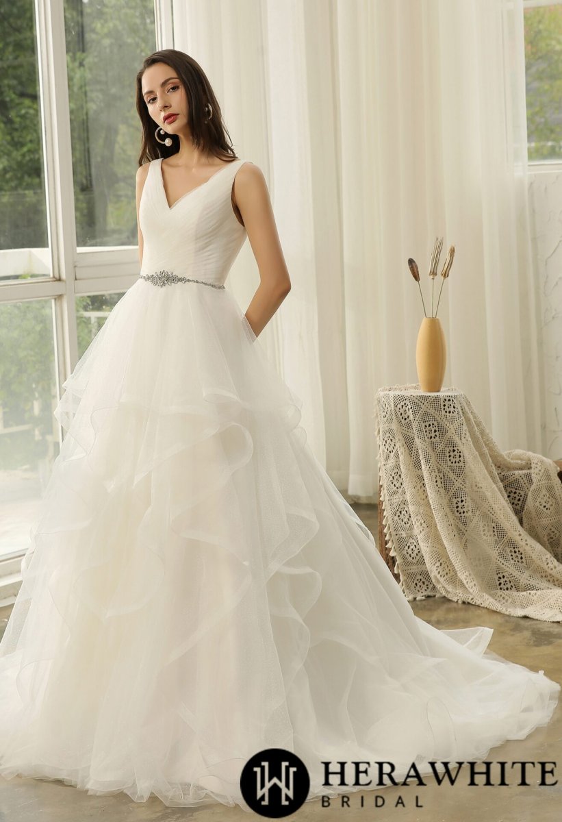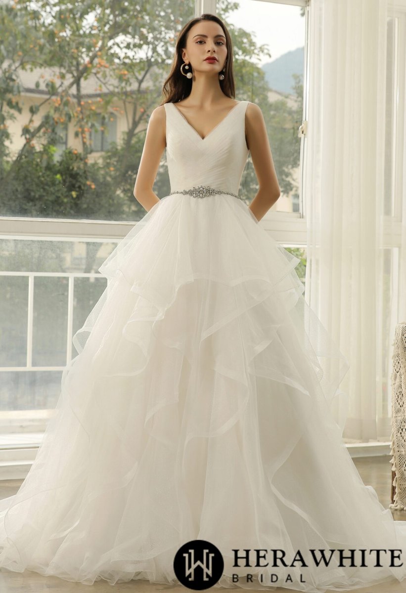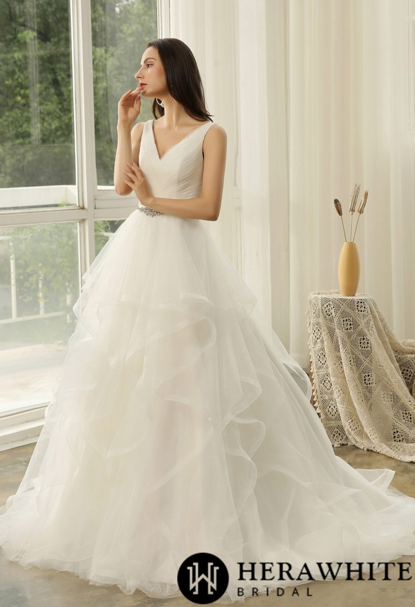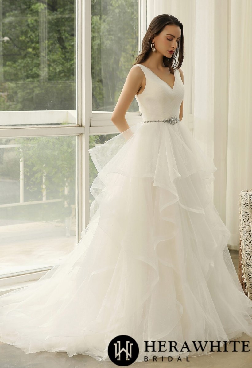 - Avantage : Robe de mariée princesse à volants et ceinture traîne, bretelles, col V, paillettes, plis