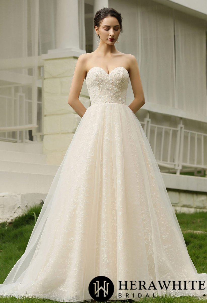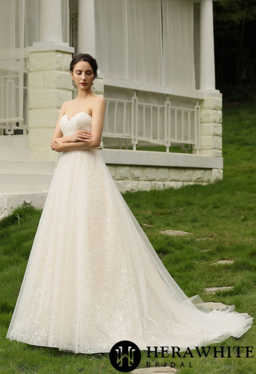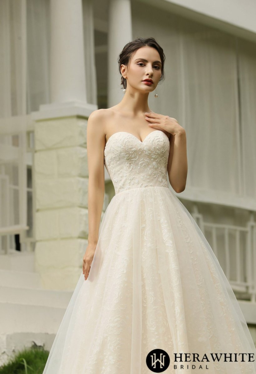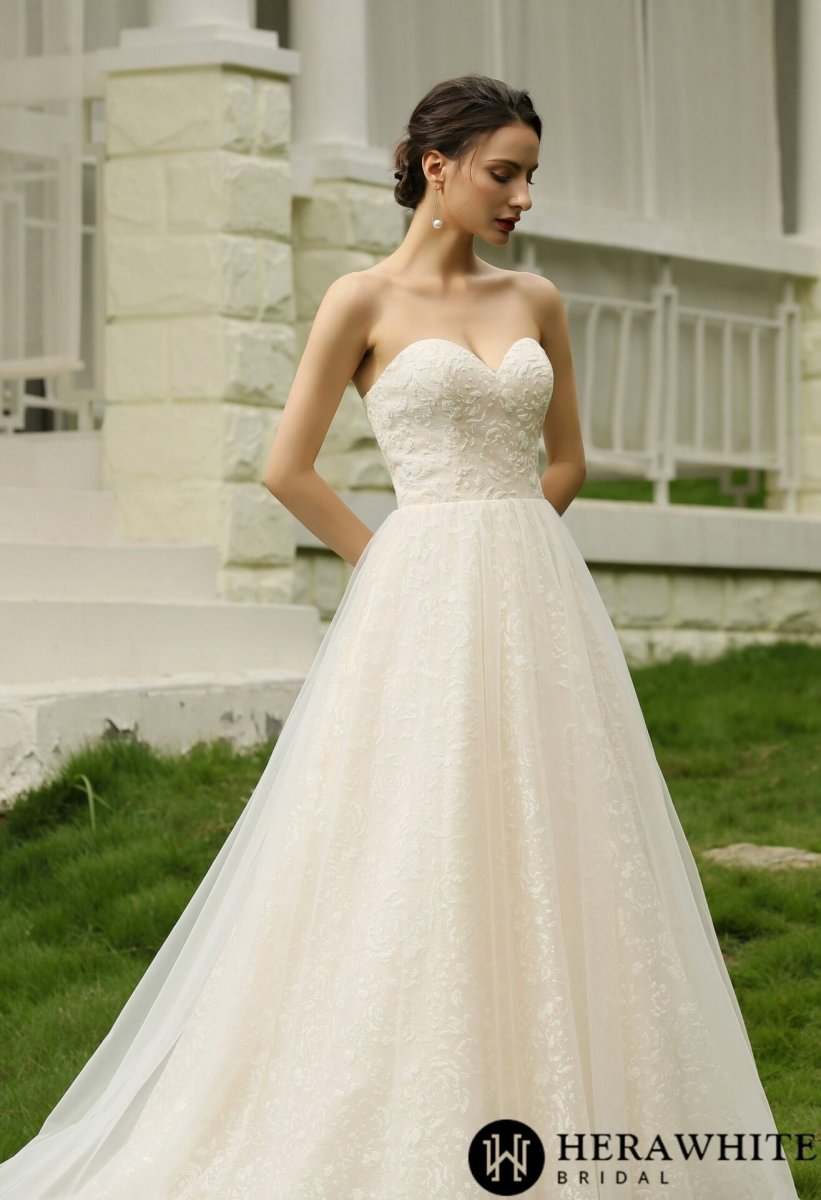 - Avantage : Robe de mariée princesse bustier et dentelle dos nu, col cœur, traîne, motifs pailletés