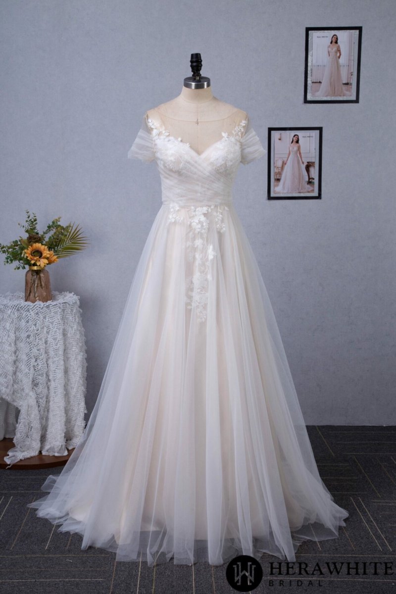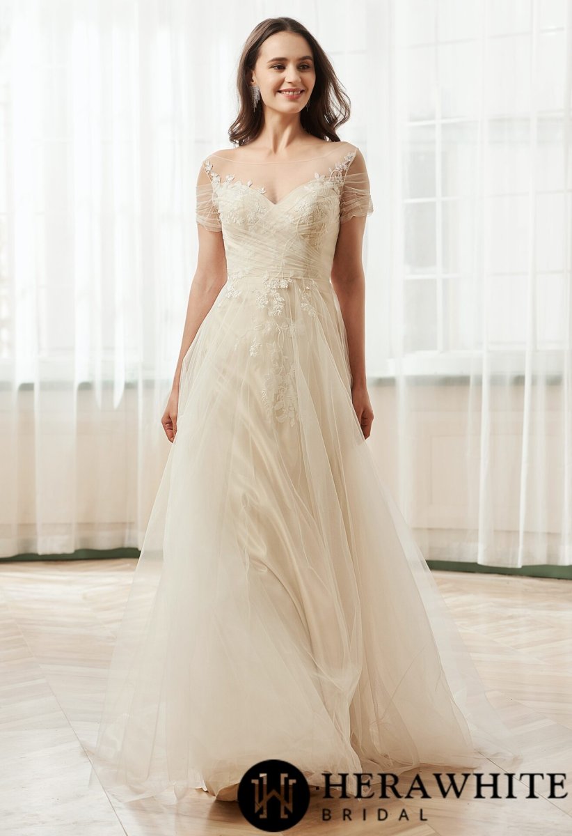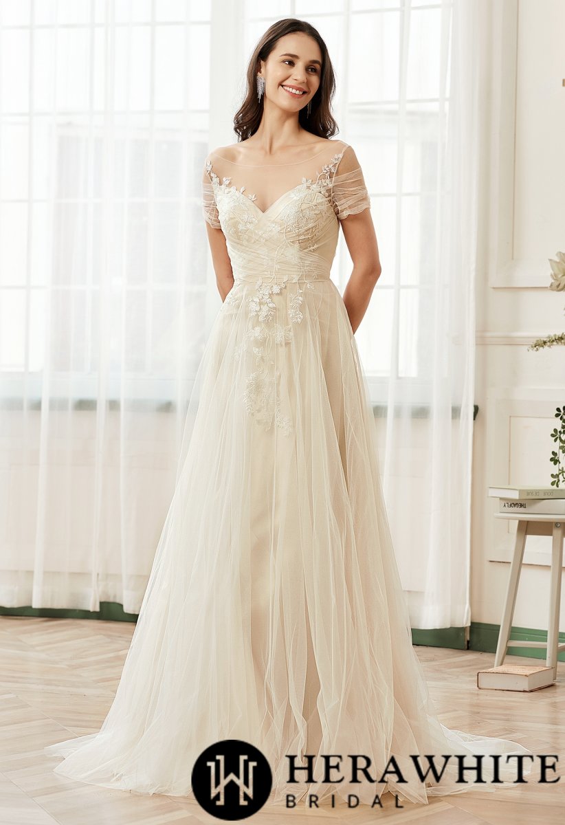 Robe de mariée romantique à corsage plissé en tulle avec illusion sur l’épaule