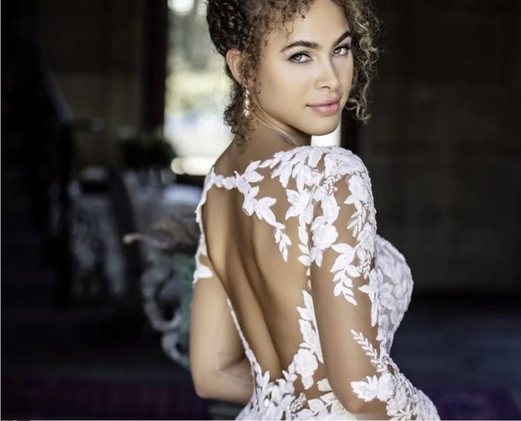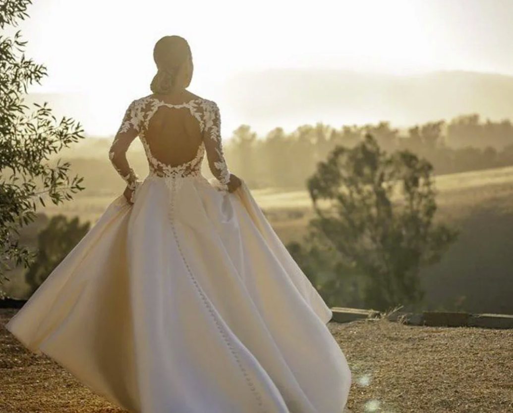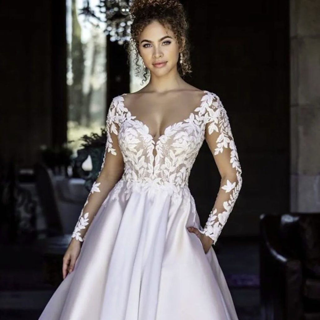 - Avantage : Robe De Mariée Satin Plissé A Traîne Dentellé col V, manches longues illusions, dentelle florale, traîne, dos nu