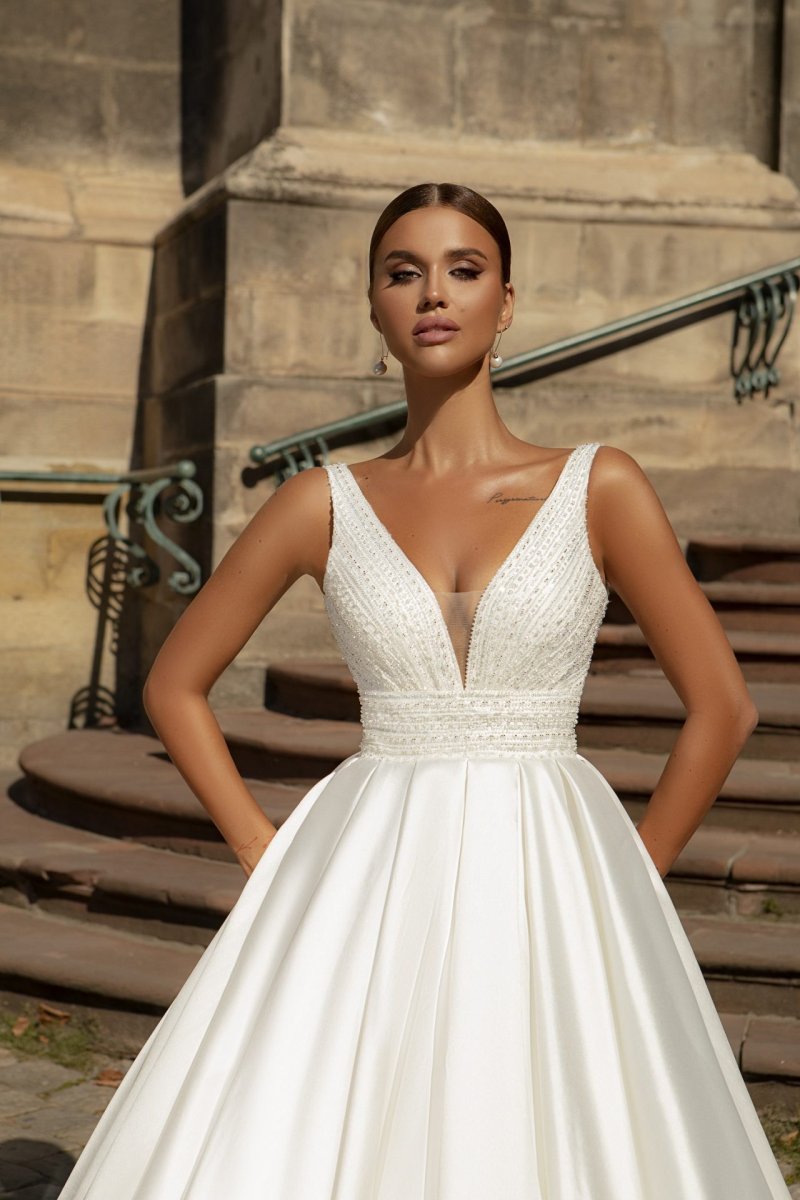 - Avantage : Robe De Mariée Satin col V, dos nu semi-nu, bretelles, traîne, plis, perles