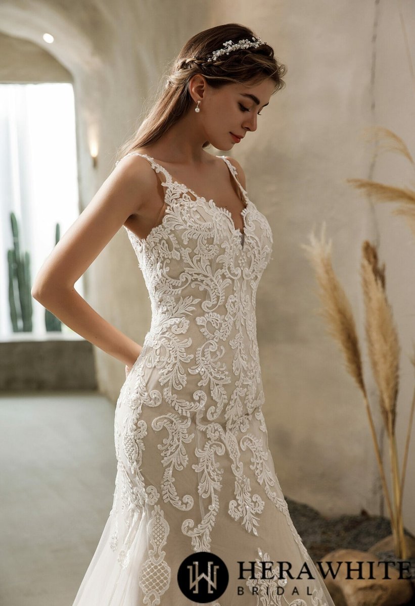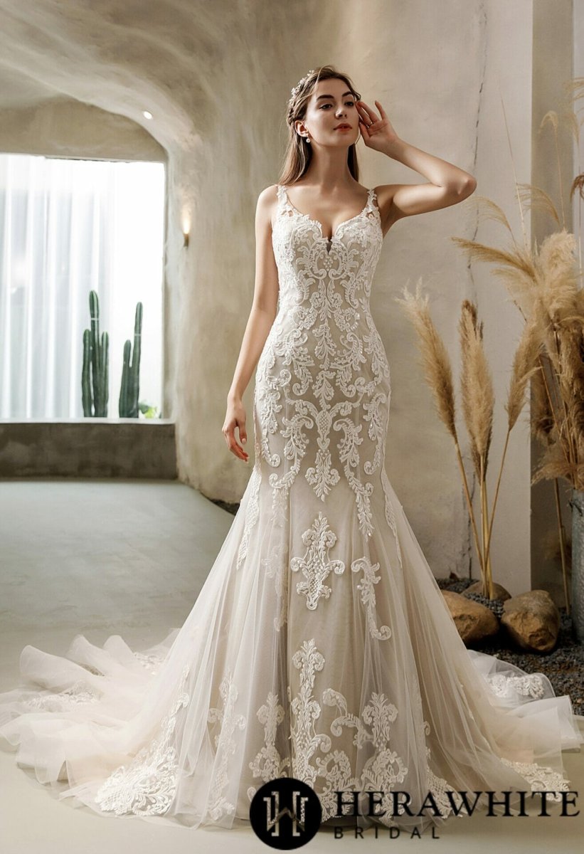Cette magnifique Robe de mariée sirène en dentelle vintage avec traîne et dos nu est faite pour vous ! Sulfureuse et sophistiquée, pleine d’appliques de dentelle géométriques, cette robe de mariée ajustée et évasée présente une douce encolure en V et des bretelles avec des appliques vintage, tandis que le dos ouvert et décolleté, garni […]