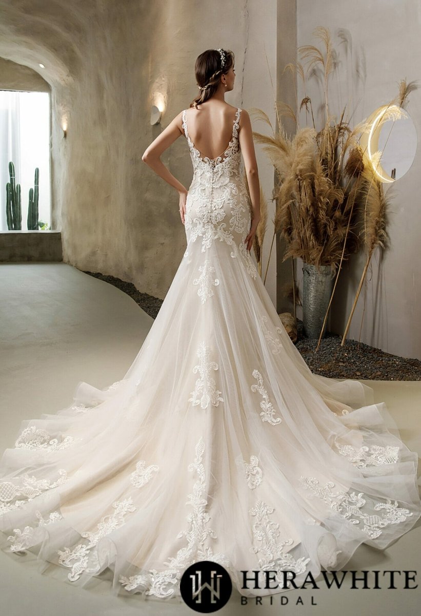 Robe de mariée sirène en dentelle vintage avec traîne et dos nu