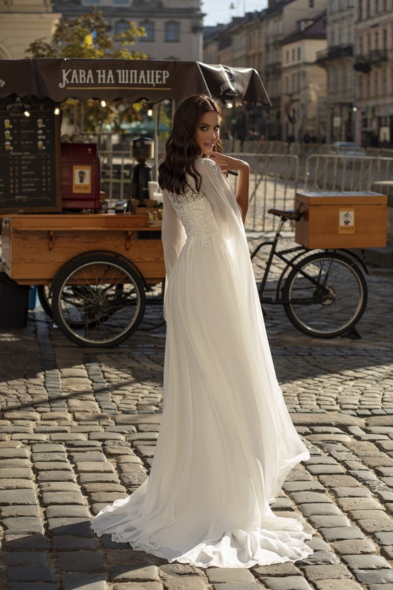 - Avantage : Robe De Mariée Style Bohème Blanche col montant illusion, liseré, traîne, motifs floraux