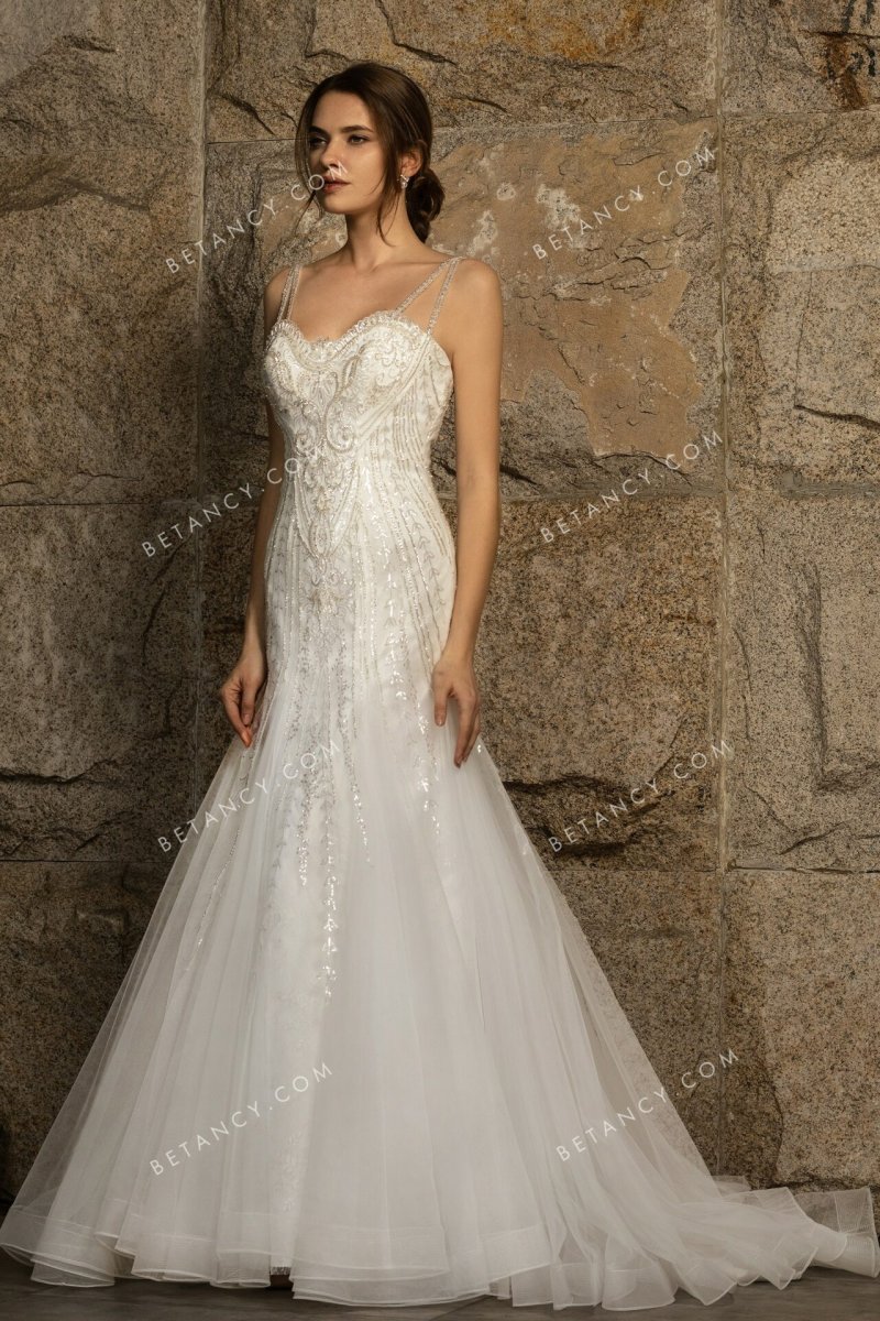 - Avantage : Robe De Mariée Trompette A Volants Blanche sequins, traîne, liseré, fines bretelles, col cœur