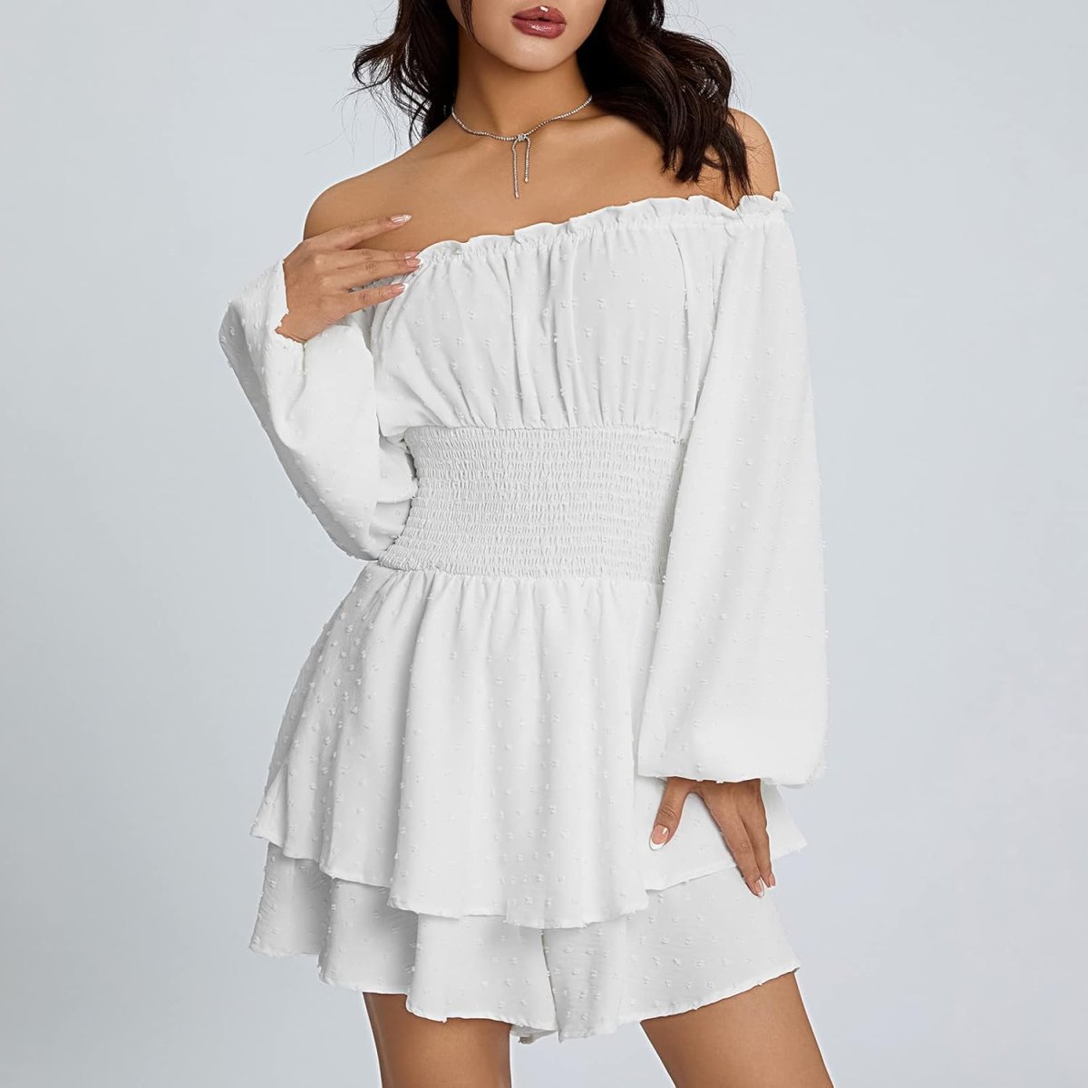 Mots-clés : robe à volant, Loalirando, shorts intégrés, mini robe à manches longues, lanternes épaules dénudées, chic élégante, femme moderne, confortable, pratique, occasions spéciales.