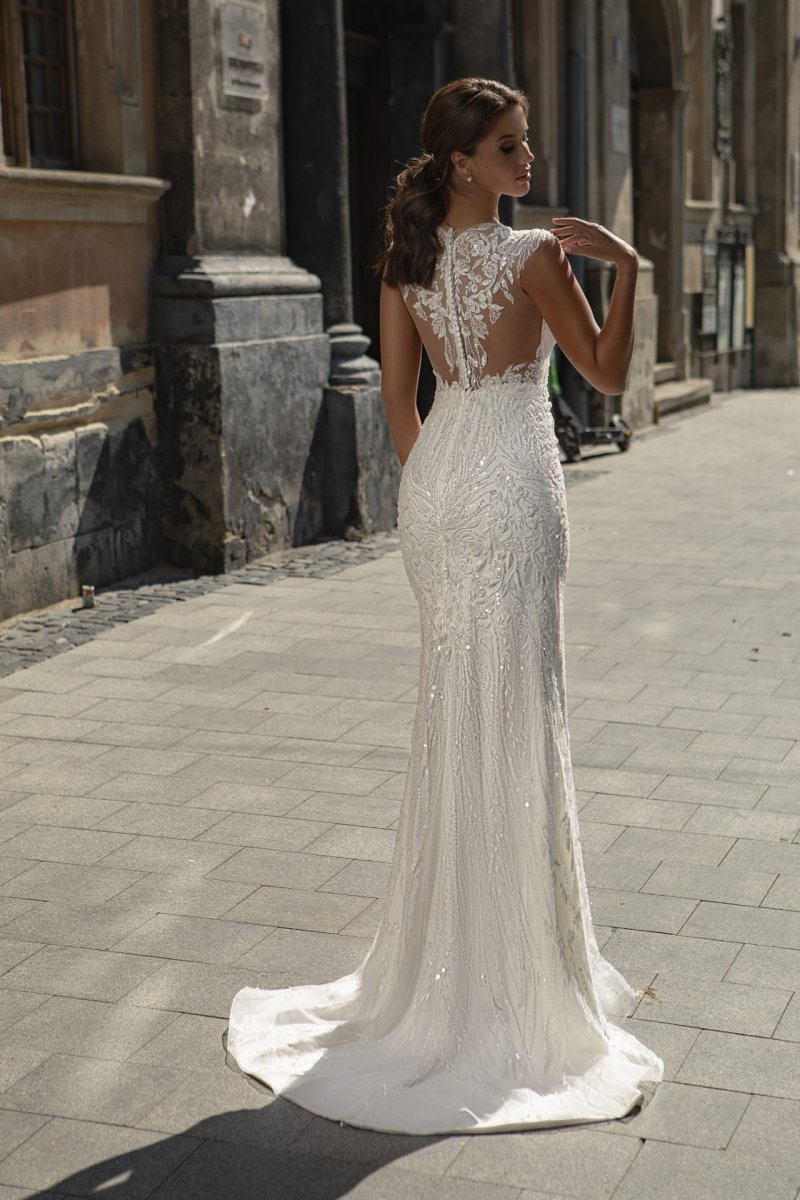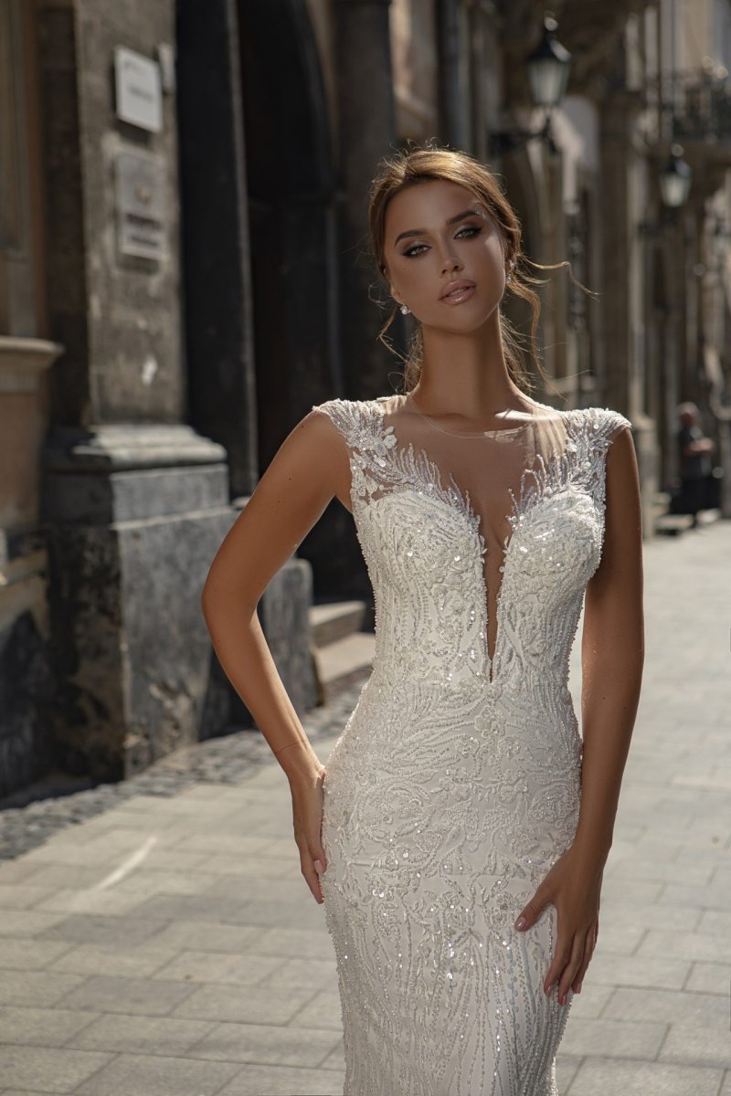 - Avantage : Sirène Robe De Mariée perles, sequins, manches courtes, col V, traîne, sur-jupe détachable