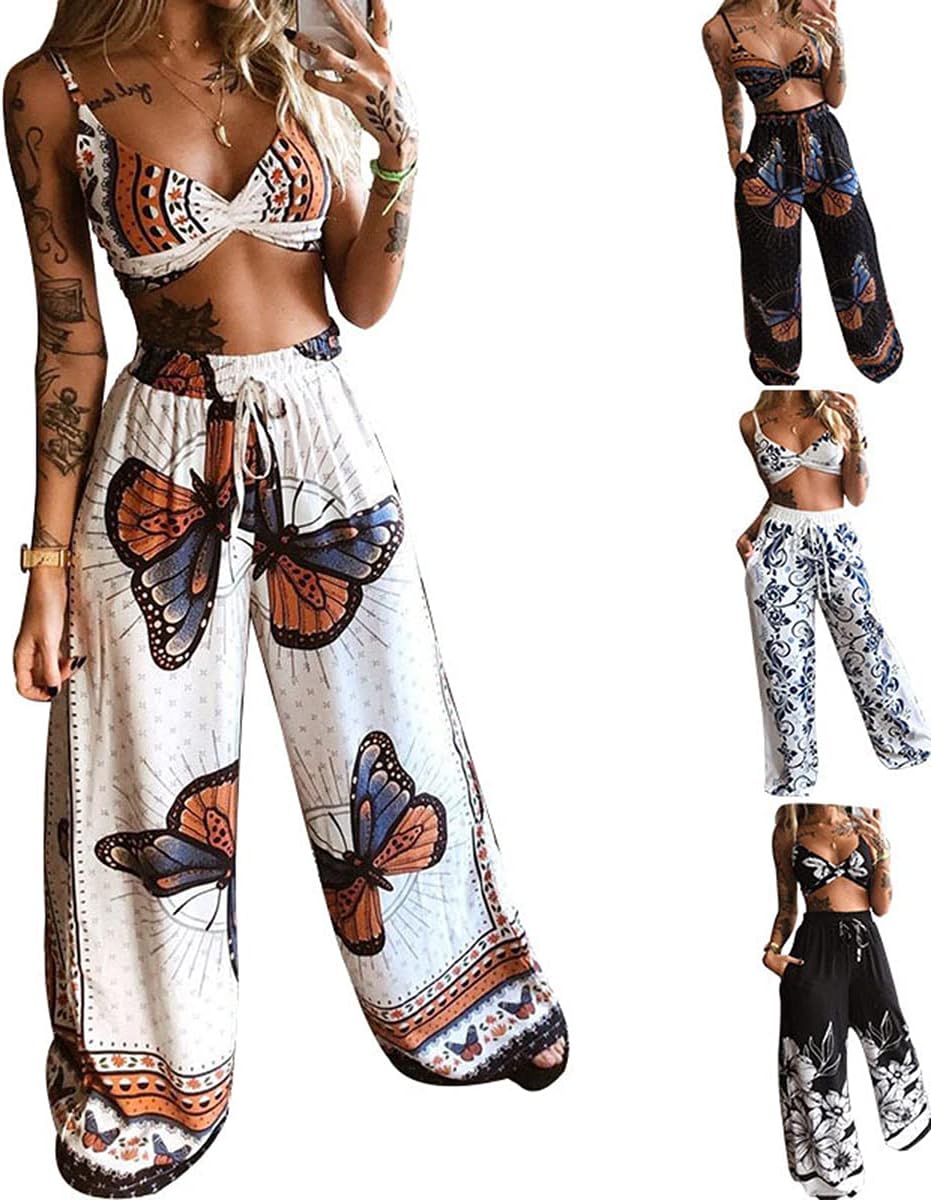 Découvrez cette Tomwell Ensemble Femmes Boho Costume de Pantalon Large Décontracté Taille Haute Soutien Gorge Gilet Court Crop Top Camisole Bikini Plage Tenues au prix imbattable de :
