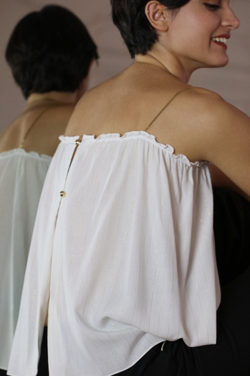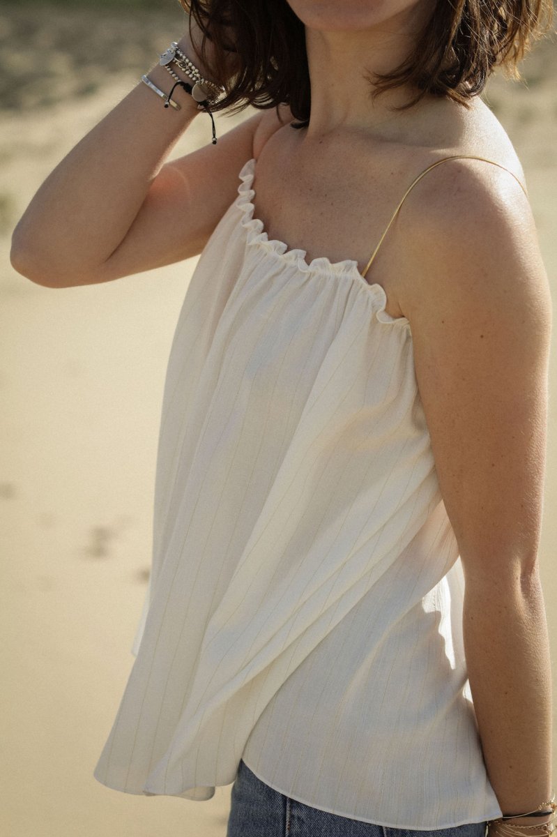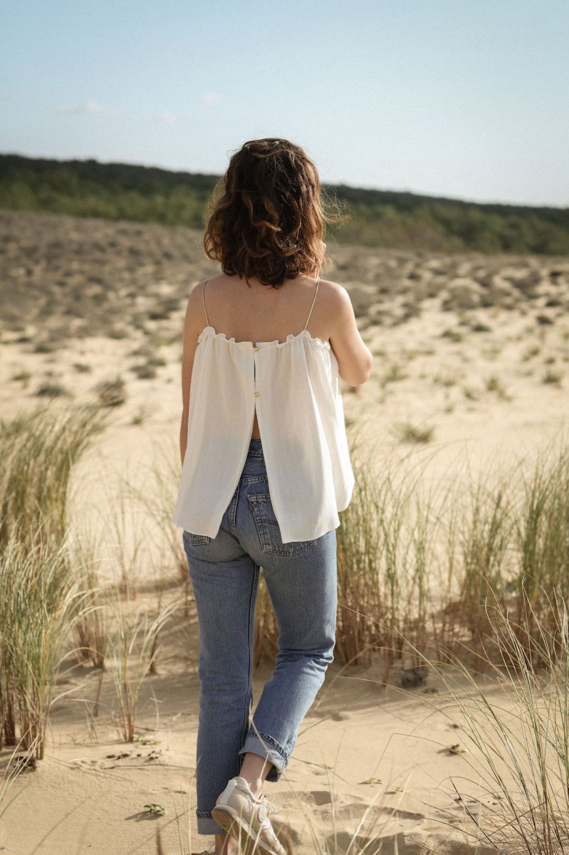 Le petit top qu’on devrait toutes avoir dans notre dressing est de retour. C’est l’indispensable top ISLA avec ses fines bretelles délicates, sa matière fluide qui apporte de la tendresse et de la douceur. Ses jolies finitions au dos le rendent complètement unique, la féminité à l’état pur, à obtenir absolument ! • Top débardeur fluide • Fines bretelles dorés • Débardeur ample, fluide ouvert au dos • 2 Boutons dorés Ce produit à été fabriqué avec amour dans mon atelier Bordelais Envoi sous 5 à 10 jours ouvrés