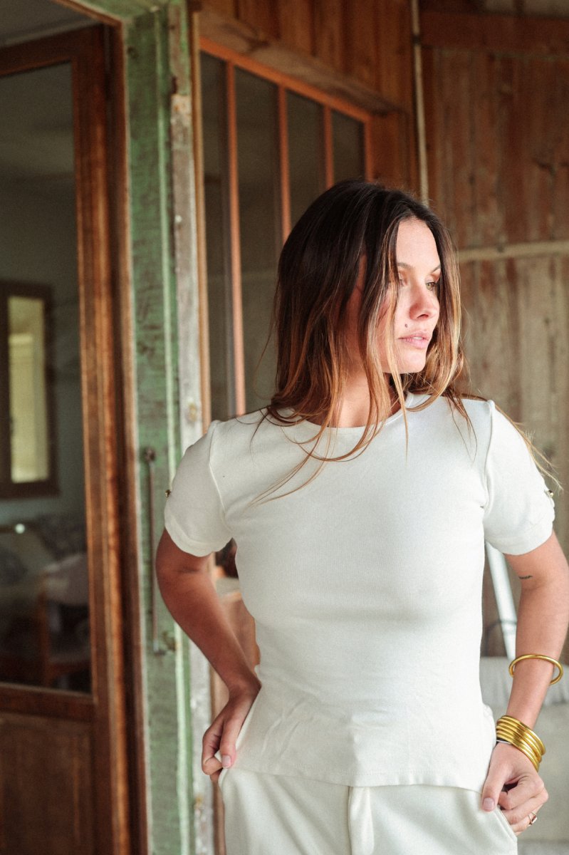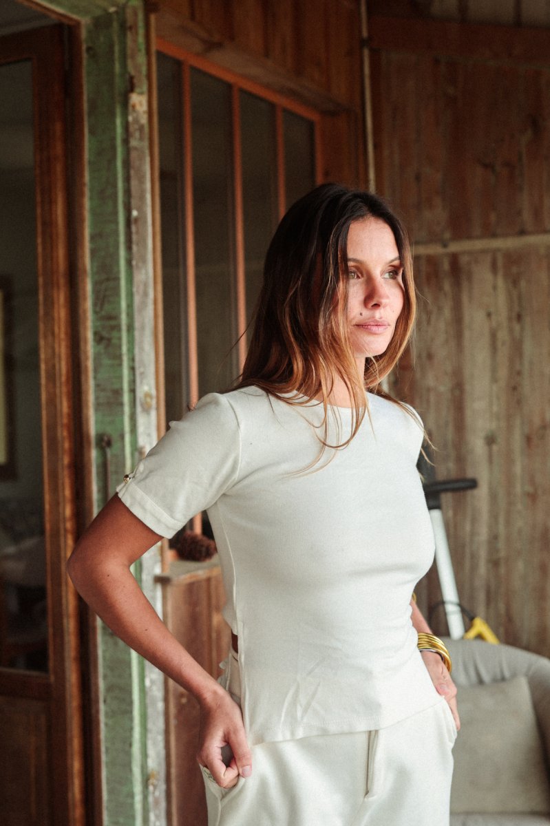 T-SHIRT DOS NU Top moulant avec un col rond chic Manches courtes avec un bouton doré sur le coté Dos légèrement nu avec lanière réglable à deux petits boutons dorés